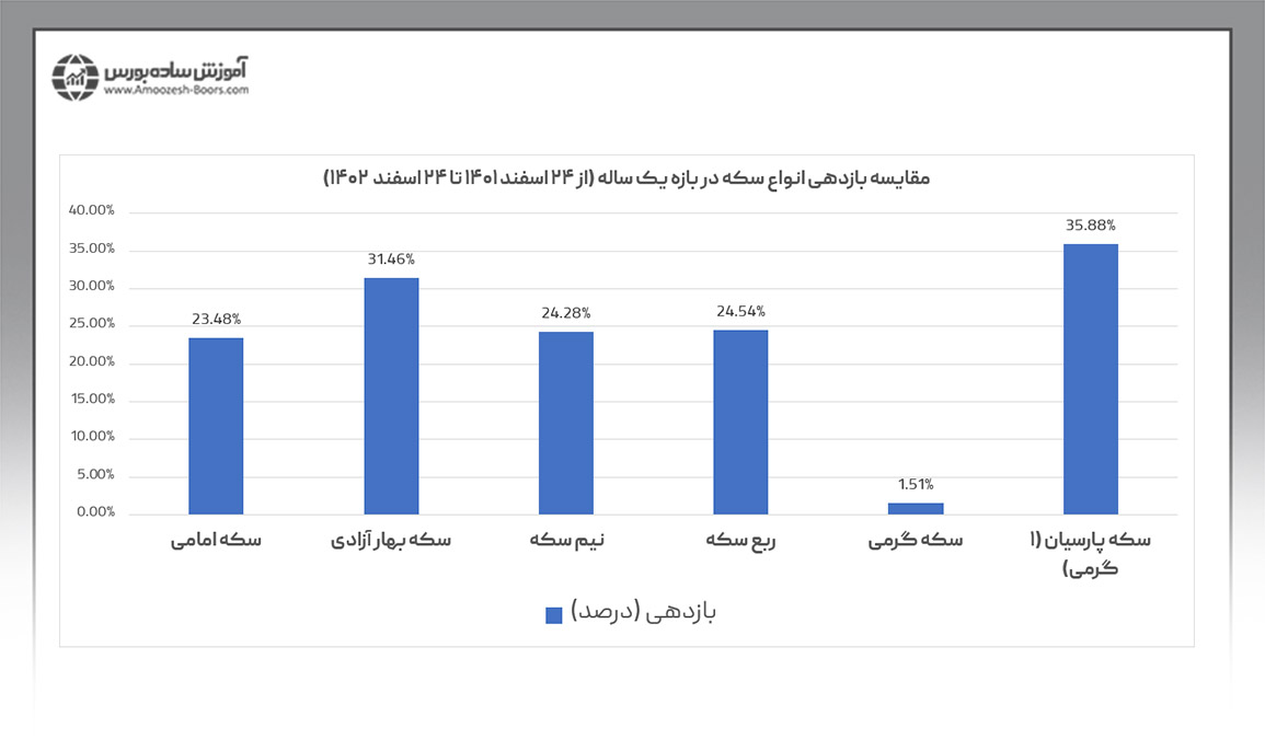 بازدهی گذشته انواع سکه طلا تا حدودی مشخص کننده میزان بازدهی آنها در آینده خواهد بود. به همین دلیل در این قسمت بازدهی انواع سکه طلا را در یکسال گذشته بررسی میکنیم. همان طور که در شکل زیر مشاهده میکنید بهترین سکه برای سرمایهگذاری در سال گذشته و در بازه زمانی یک ساله، سکه پارسیان بوده که بازدهی ۳۵ درصدی را برای سرمایهگذاران به همراه داشته است.