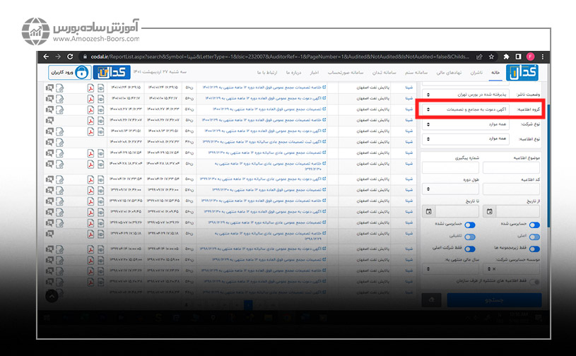 تایپ کردن نام سهم مورد نظر در قسمت نام/نماد و انتخاب «آگهی دعوت به مجامع و تصمیمات» در گروه اطلاعیهها و در نهایت فشردن کلید جستجو. با این شیوه میتوانید از جدیدترین اخبار مربوط به این مجامع باخبر شوید.