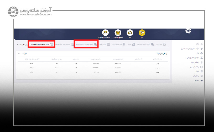 ۳- بعد از وارد کردن این کد میتوانید به پروفایل خود وارد شده و از قسمت «گزارش سودهای پرداخت شده» سودهایی که به حسابتان واریز شده است را ببینید و از قسمت «گزارش سودهای تعلق گرفته از سال ۹۶ به بعد» سودهای نقدی تعلق گرفته به خود را مشاهده کنید.