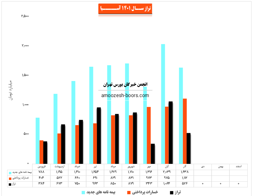 سهم آسیا در آذر ماه مبلغ 1112 میلیارد تومان به بیمه نامه های خود خسارت پرداخت کرده که این میزان با افزایش 14 درصدی نسبت به ماه گذشته روبرو شده و لذا با توجه به آمار مذکور تراز آسیا با 51% کاهش در مقایسه با ماه گذشته به مثبت 526 میلیارد تومان رسیده است.