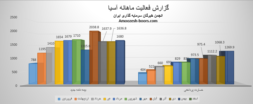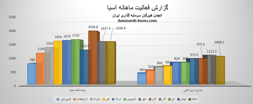 بیمه آسیا در دی ماه از محل بیمه نامه جدید به فروش 1636.8 میلیارد تومانی رسیده و مبلغ 1068.3 میلیارد تومان نیز بابت خسارات پرداخت نموده است، در نتیجه تراز سهم آسیا در دی ماه مثبت 53% میباشد، مجموع درآمد بیمه آسیا طی عملکرد 10 ماهه سال مالی رشد 52 درصدی درآمد را نسبت به مدت مشابه داشته است.