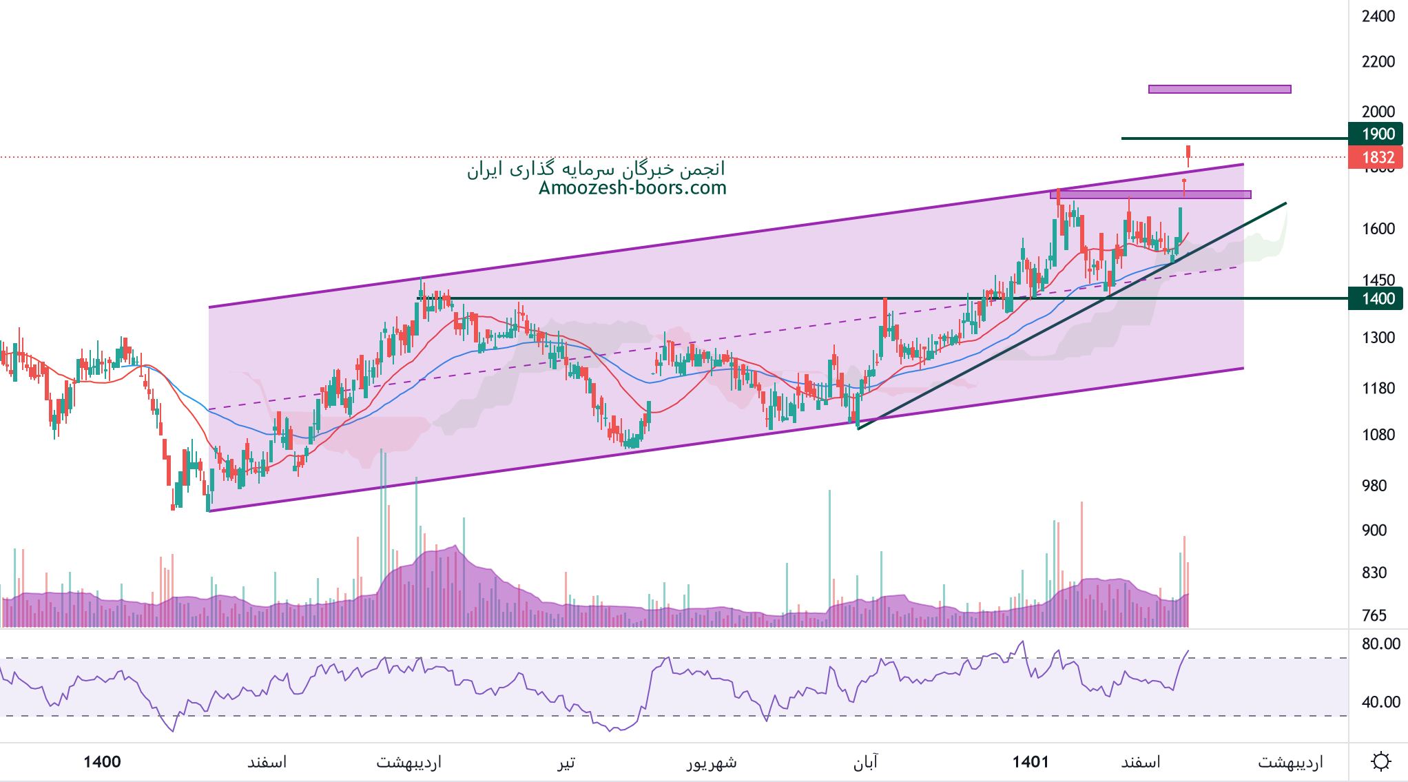 نماد آسیا که موفق به شکست مقاومت کانال صعودی خود شده در حال حاضر در محدوده حساسی قرار گرفته، در صورت ادامه دار شدن فشار خرید و عبور قیمت سهم آسیا از مقاومت 1900 ریال، حرکت سهم تا محدوده 2100 ریال محتمل خواهد بود، همچنین در صورت ورود سهم به فاز اصلاحی، حمایت های سهم به ترتیب 1800 و 1700 ریال ارزیابی میگردند.