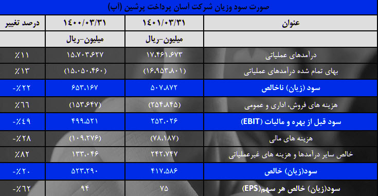 اطالعات مالی شرکت آسان پرداخت پرشین برای دوره مالی 3 ماه منتهی به 31 خرداد 1400 نشان دهنده وضعیت عملیاتی نسبت به دوره مشابه گذشته است. سود و زیان شرکت نسبت به دوره مشابه سال گذشته کاهش نسبی را نشان می دهد.درآمدهای عملیاتی شرکت در 3 ماه ابتدایی سال نسبت به دوره مشابه سال قبل با افزایش همراه بوده است. با این حال افزایش هزینه های عملیاتی در مقطع مذکور منجر به کاهش سودآوری شرکت گردیده که تورم اقتصادی حاکم بر کشور از عوامل تاثیرگذار بوده است