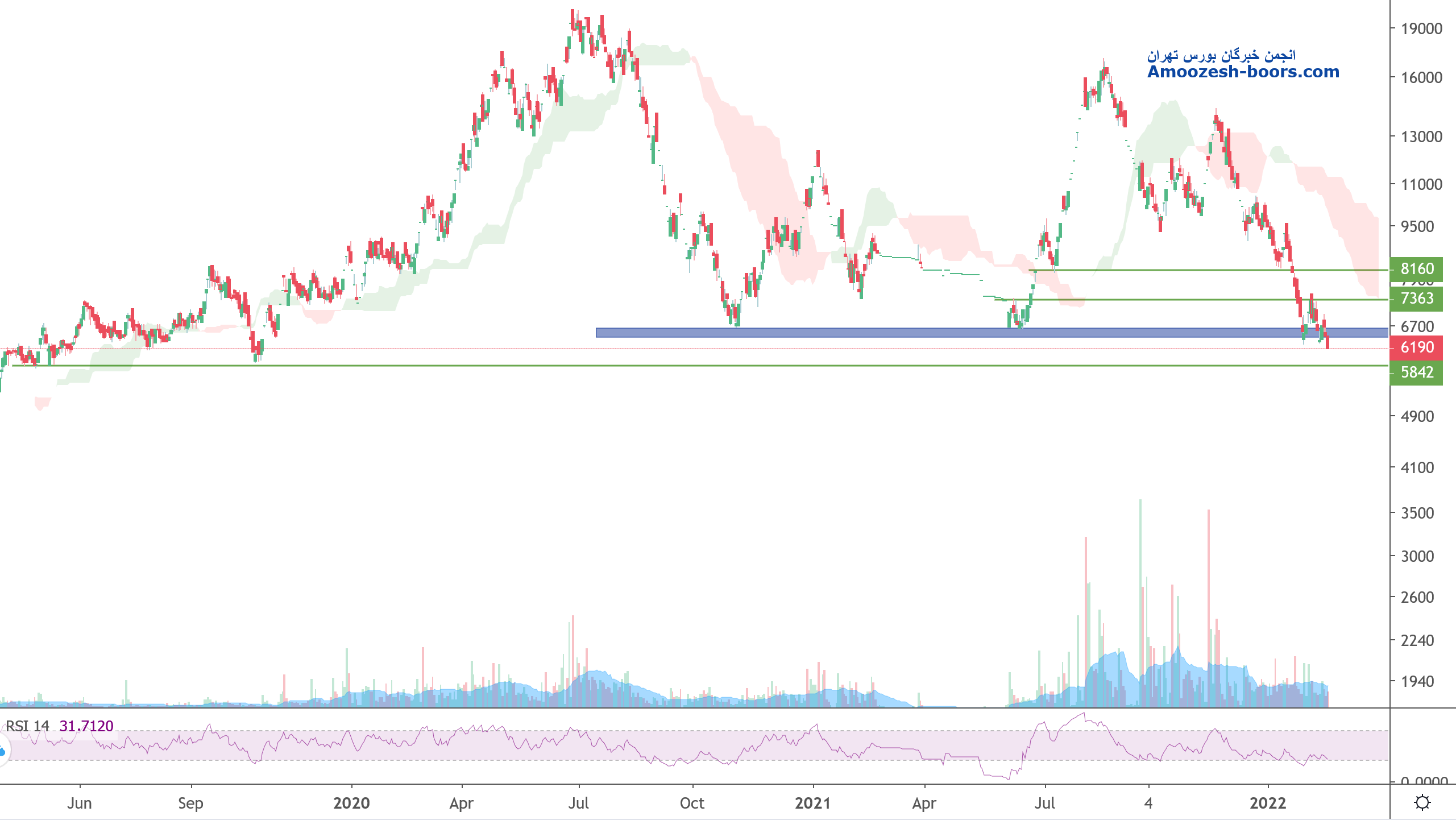 قیمت در ادامه روند نزولی محدوده حمایتی 6400 ریال را شکسته و به سمت حمایت استاتیک 5800 ریال در حرکت است در صورت از دست رفتن این حمایت حمایت بعدی 4600 ریال خواهد بود که در این صورت حد ضرر فعال خواهد شد و در صورت تثبیت اولین مقاومت سهم حمایت شکسته شده در نظر گرفته خواهد شد.