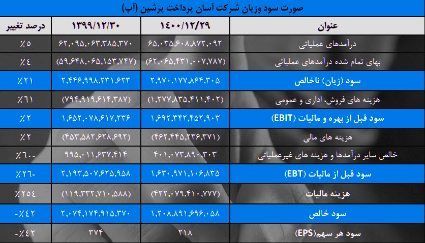اطلاعات مالی شرکت آسان پرداخت پرشین براي سال منتهی به 29 اسفند 1400 نشان دهنده افزایش درآمدهاي عملیاتی نسبت به دوره مشابه گذشته است. به طور کلی با توجه به صورت سود و زیان ارائه شده در جدول زیر شرکت آسان پرداخت در سال مالی گذشته از وضعیت مطلوبی برخوردار بوده است و حاکی از افزایش 21 %سود ناخالص و افزایش 2 %در سود عملیاتی می باشد. دلیل عمده افزایش هزینه هاي فروش، اداري و عمومی، اعمال اسناد تعدیالت سنواتی مرتبط با سال هاي گذشته در سود و زیان دوره طبق نظر حسابرس می باشد.الزم به ذکر است عمده کاهش سود خالص شرکت نسبت به سال گذشته ناشی از هزینه مالیات و کاهش در درآمدهاي غیر عملیاتی بوده که رکود بازار سرمایه از دالیل آن می باشد.