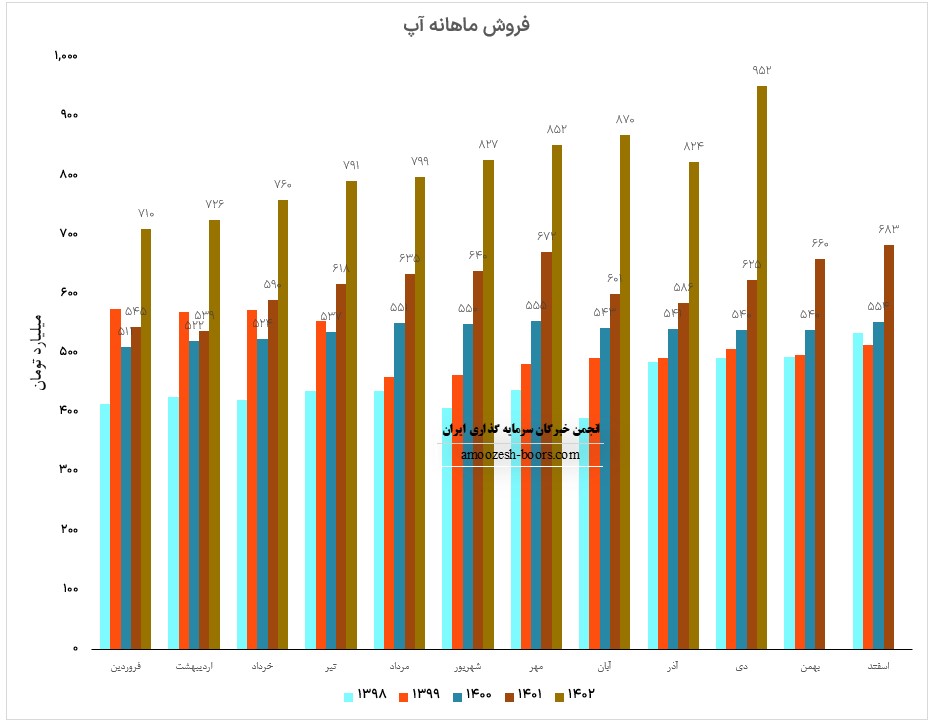 فروش آذر ماه سال 1402 سهم آپ 824 میلیارد تومان گزارش شده است، تغییرات درآمدی آپ به شرح زیر میباشد: