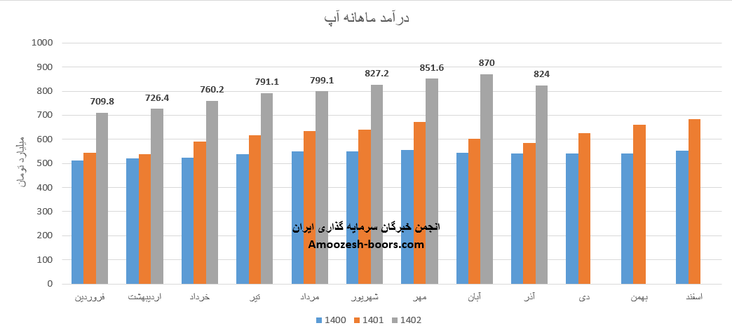 درآمد آبان ماه سال 1402 سهم آپ 870 میلیارد تومان بوده است که در مقایسه با ماه گذشته 2% داشته است.