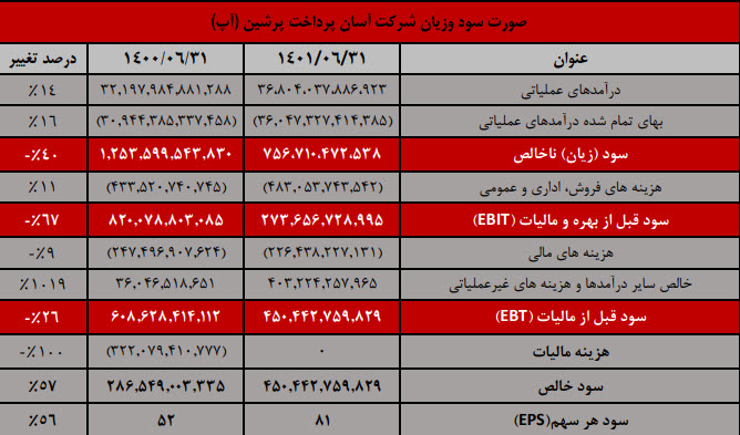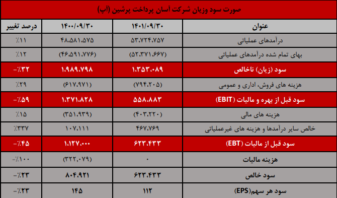مطابق با گزارش صورت مالی میان دوره ای 6 ماهه آپ  به ازای هر سهم 81 ریال سود محقق شده است که نسبت به دوره مشابه سال قبل (56%) افزایش داشته است. سود ناخالص 40% افت، سود عملیاتی 67% افت، درآمدهای عملیاتی 14% رشد و هزینه های مالی9% افت داشته است.حاشیه سود ناخالص شرکت در دوره 6 ماهه 1401، 2.1 درصد گزارش شده است که این عدد در 6 ماهه سال 1400 حدود 3.9 درصد بوده است.درآمد کلی نماد آپ (شرکت آسان پرداخت پرشین) حدودا با رشد 14 درصدی در شش ماهه نخست 1401 نسبت به مقطع مشابه سال قبل همراه بوده است که این رشد عمدتا ناشی از افزایش2 درصدی درآمد کارمزد شاپرکی و افزایش 38 درصدی سایر درآمدهای عملیاتی شرکت می باشد