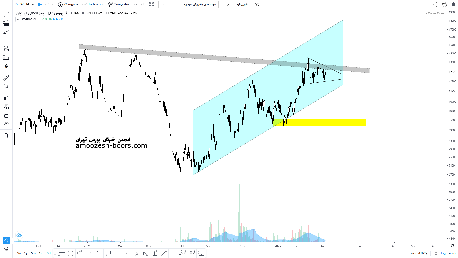 قیمت در جریان حرکت صعودی کوتاه مدت خود مقاومت های 12500 و 14500 را تا تست قله تاریخی خو سر راه خود دارد . همچنین در صورت اصلاح قیمتی ، حمایت 10000 ریال در نظر گرفته خواهد شد .