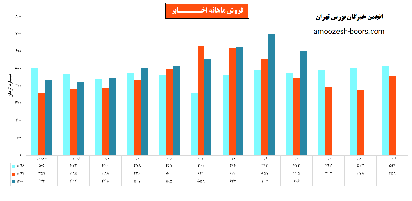نماد اخابر در آذر 1400 ، مبلغ 606 میلیارد تومان درامد داشته که این میزان نسبت به ماه گذشته 14% افت و همچنین نسبت به مدت مشابه سال گذشته 36% رشد پیدا کرده است!