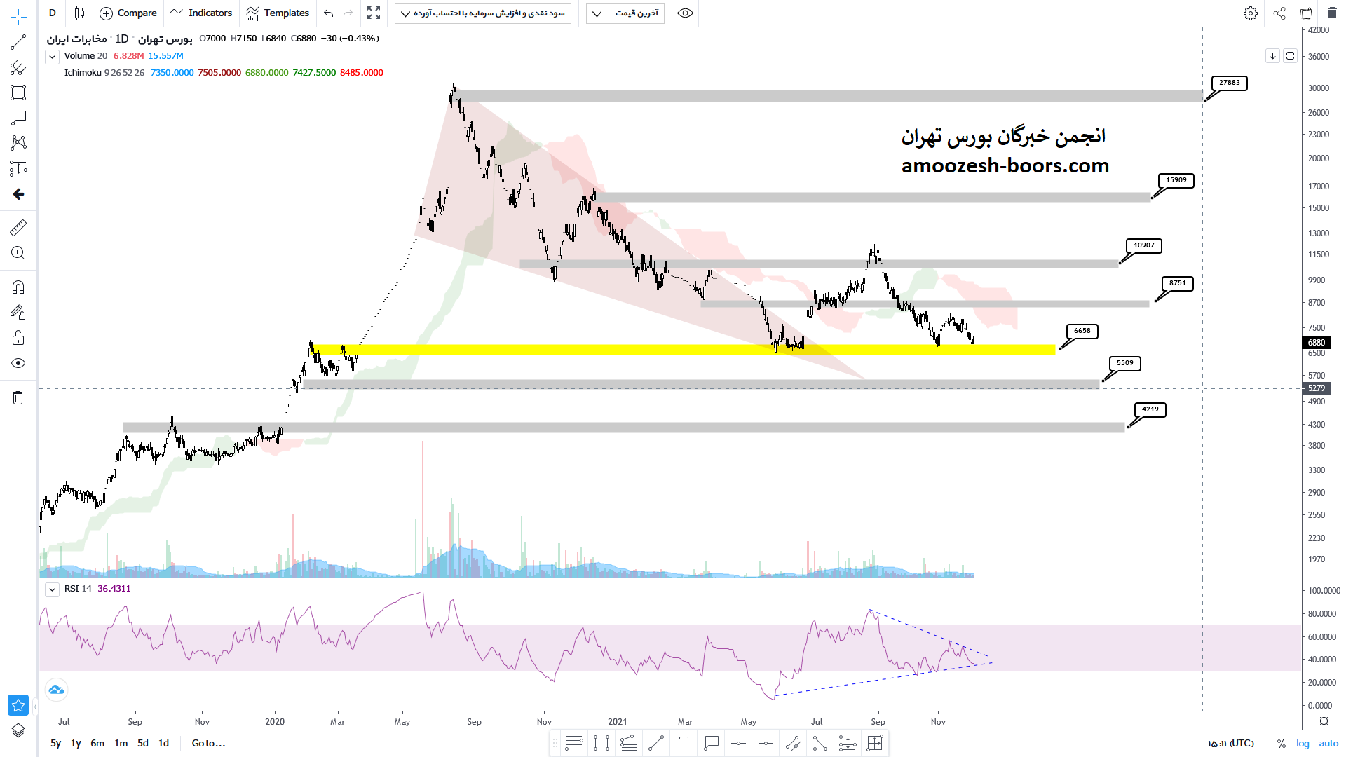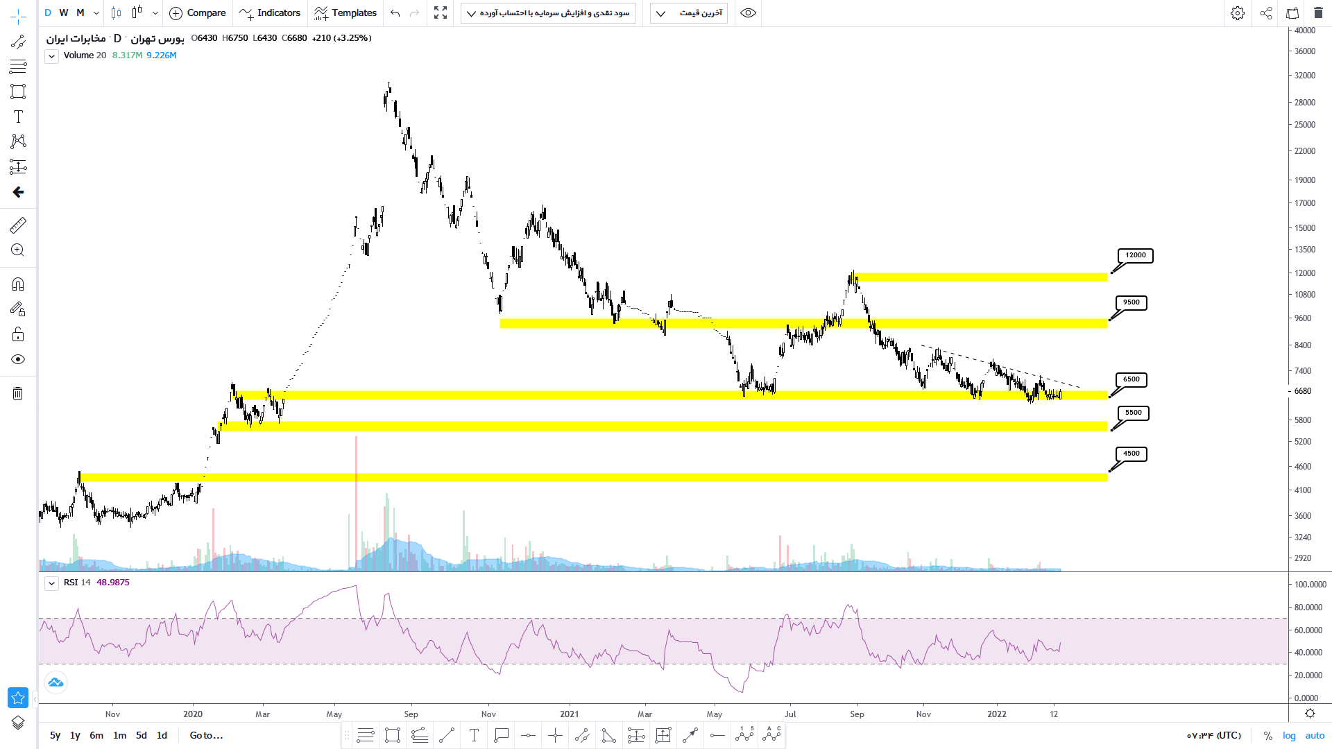 چارت این نماد پس از تکمیل یک الگوی اصلاحی (کنج نزولی) اکنون درصورت واکنش مثبت به محدوده حمایتی 660 تومان میتوان با تایید تشکیل کف دوقلو که یک الگوی بازگشتی میباشد اصلاح خود را به اتمام رسانده و به مدار صعودی بازگردد که به ترتیب مقاومت های 870 تومان و 1000 تومان را درصورت صعود پیش روی خود دارد