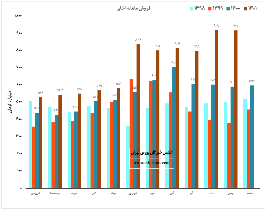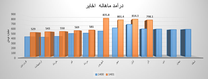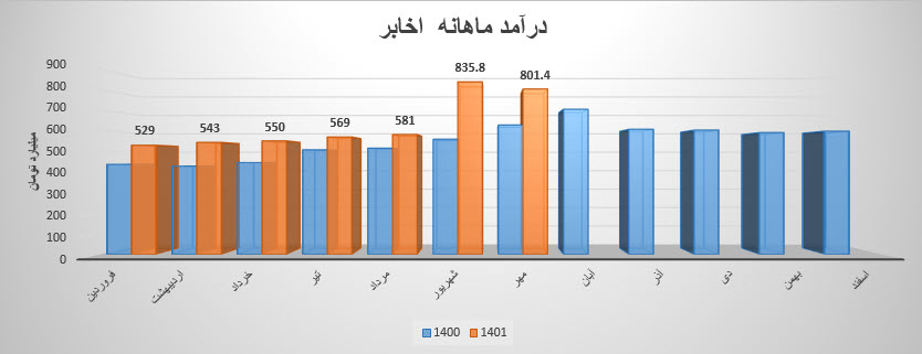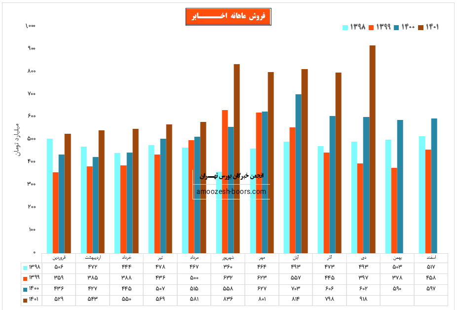 نماد اخابر (شرکت مخابرات ایران) در بهمن ماه 1401 حدود مبلغ 917 میلیارد تومان درآمد داشته که این میزان در مقایسه با ماه گذشته بدون تغییر و همچنین در مقایسه با مدت مشابه سال گذشته 55% رشد پیدا کرده است.