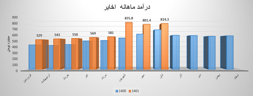 سهم اخابر در عملکرد ماهانه آبان به درآمد 814.3 میلیارد تومان دست یافت . درآمد نماد اخابر تغییرات زیر را تجربه نموده است .