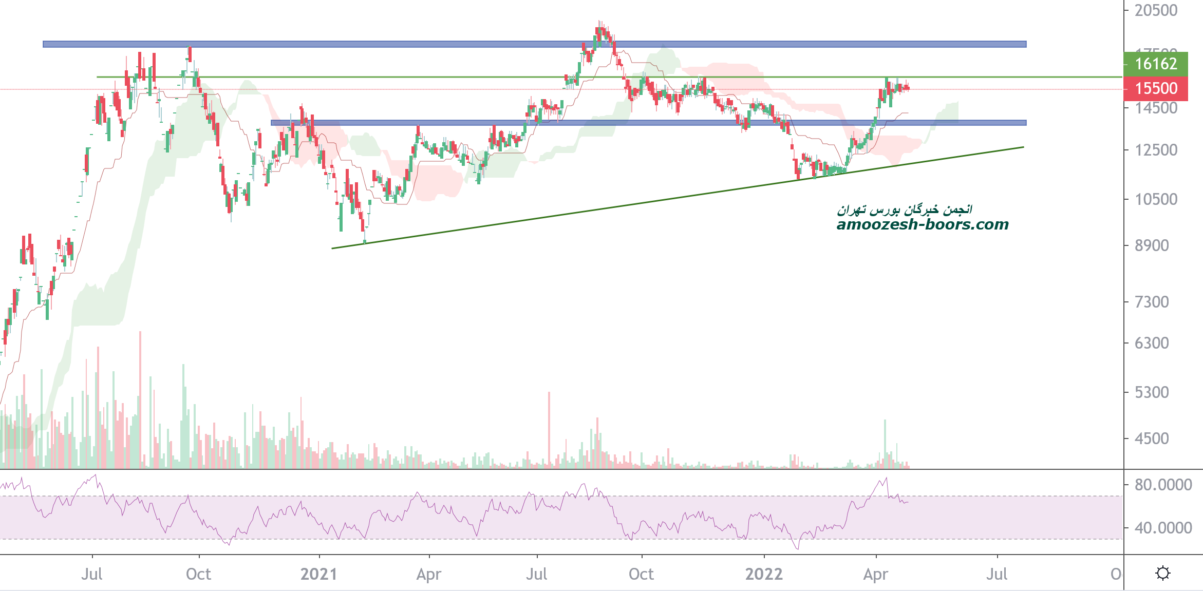 قیمت در حال حاضر درگیر مقاومت استاتیک میباشد و در صورت افزایش فشار تقاضا و عبور از این مقاومت و تثبیت بالای آن،مقاومت بعدی 18000 ریال در نظر گرفته خواهد شد و در صورتی که سهم وارد فاز اصلاحی شود حمایت های های سهم به ترتیب 14000 و 12300 ریال در نظر گرفته خواهد شد.