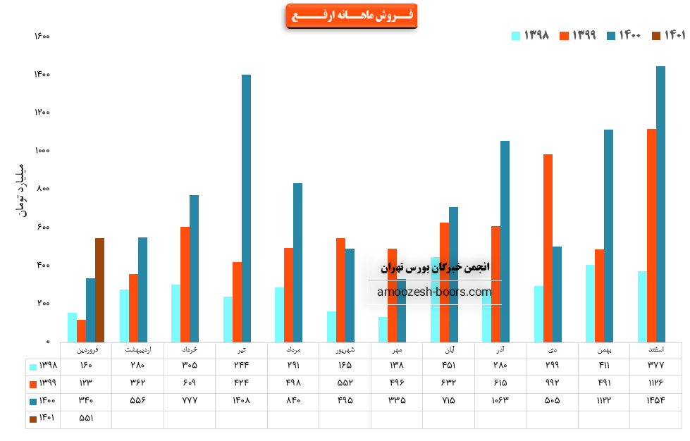 شرکت آهن و فولاد ارفع و نماد ارفع در فروردین ماه و در اولین ماه سال جاری حدود مبلغ ۵۵۱ میلیارد تومان درآمد داشته که این میزان در مقایسه با ماه گذشته ۷۰ % کاهش و همچنین در مقایسه با مدت مشابه سال گذشته ۱۷۶ % رشد درآمد پیدا کرده است. شرکت پس از فروش فوق العاده ای که در اسفند ماه داشته نتوانسته آن را در اولین ماه سال جاری نیز تکرار کند.