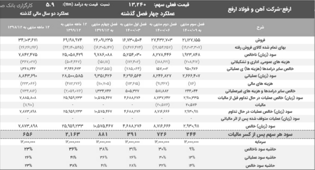 شرکت نسبت به دوره 1 ماهه مشابه سال قبل 10% کاهش درآمد داشته است. ارفع در شهریورماه 34 هزار تن شمش فولادی فروخته که نسبت به مردادماه 40% افت داشته است. ضمن آنکه در شهریورماه هیچ صادراتی نداشته است. میانگین نرخ فروش شمش(داخلی و صادراتی) شرکت، نسبت به مردادماه حدود 1.7% افت داشته است.