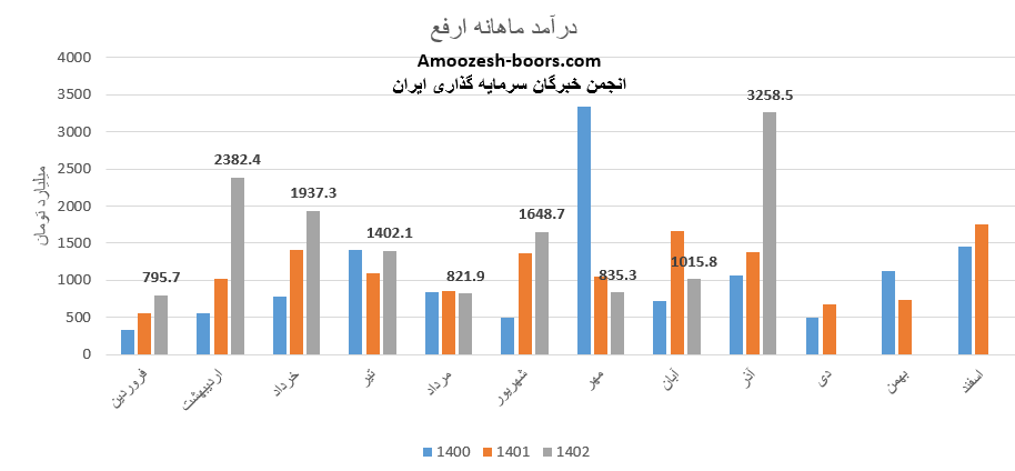 درآمد آبان ماه سال 1402 سهم ارفع 1015.8 میلیارد تومان بوده است که در مقایسه با ماه گذشته 82% کاهش داشته است.