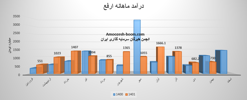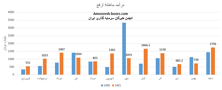 بر اساس گزارش عملکرد ماهانه شرکت آهن و فولاد ارفع درآمد اسفند 1401 شرکت معادل 1756 میلیارد تومان گزارش شده که این رقم تغییرات زیر را تجربه نموده است :