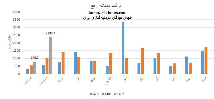 نماد ارفع (شرکت آهن و فولاد ارفع) در فروردین ماه سال 1402 حدود مبلغ 796 میلیارد تومان درآمد داشته که این میزان در مقایسه با ماه گذشته 55% کاهش و همچنین در مقایسه با مدت مشابه سال گذشته 44% رشد درآمد پیدا کرده است.