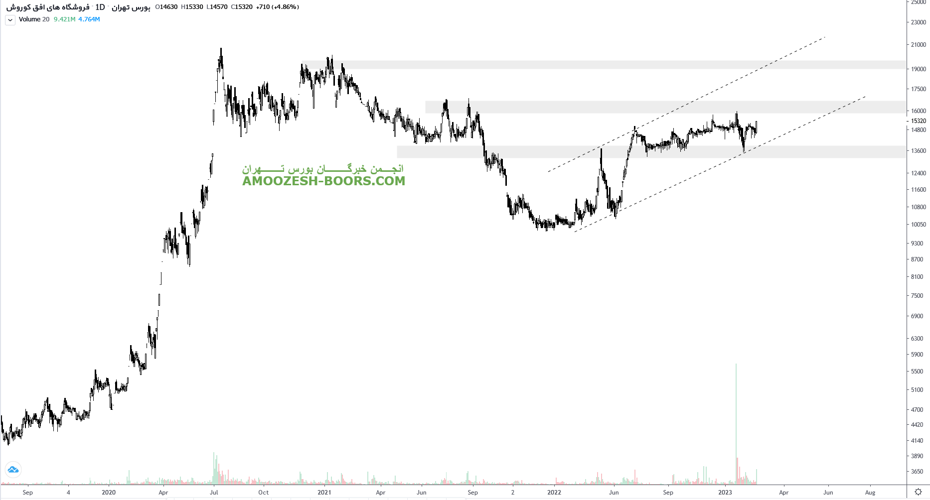 قیمت سهم افق پس از بروز واکنش مثبت به ناحیه حمایت ۱۳۰۰ تومان اکنون در حال حرکت به سمت مقاومت ناحیه ۱۶۰۰ تومان می باشد لذا در صورت شکست این ناحیه مقاومتی، مقاومت بعدی سهم افق ناحیه ۱۹۵۰ تومان تعیین شده است.