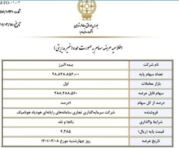 سهم البرز در این ماه تراز مثبت %43 را ثبت نموده است. همچنین شرکتدر خصوص عرضه بلوکی خود اطلاعیه زیر را افشا نموده است .