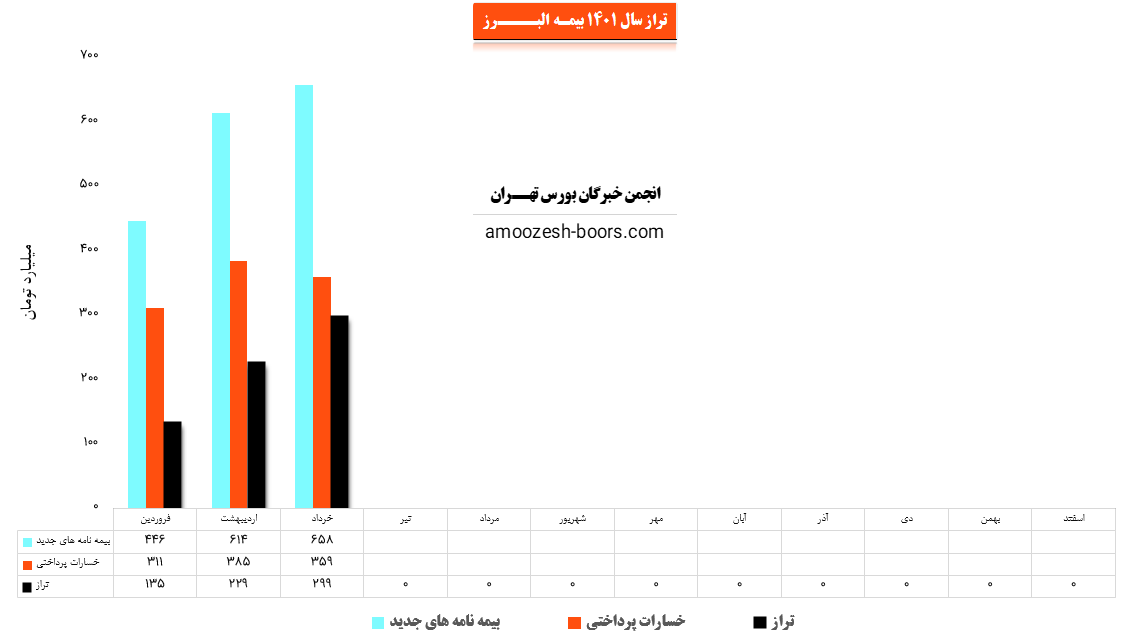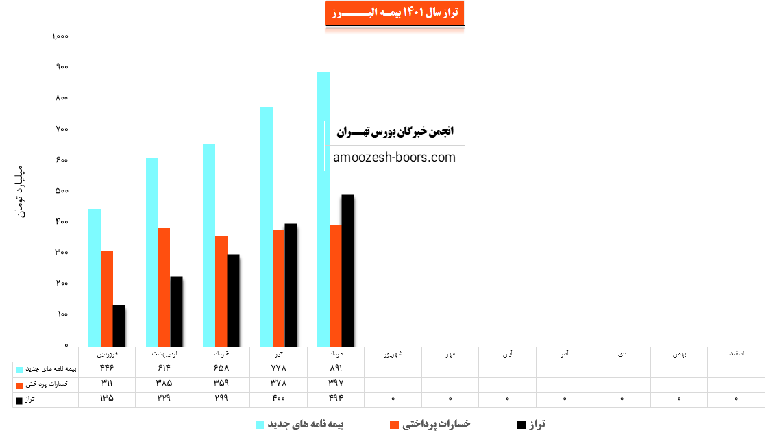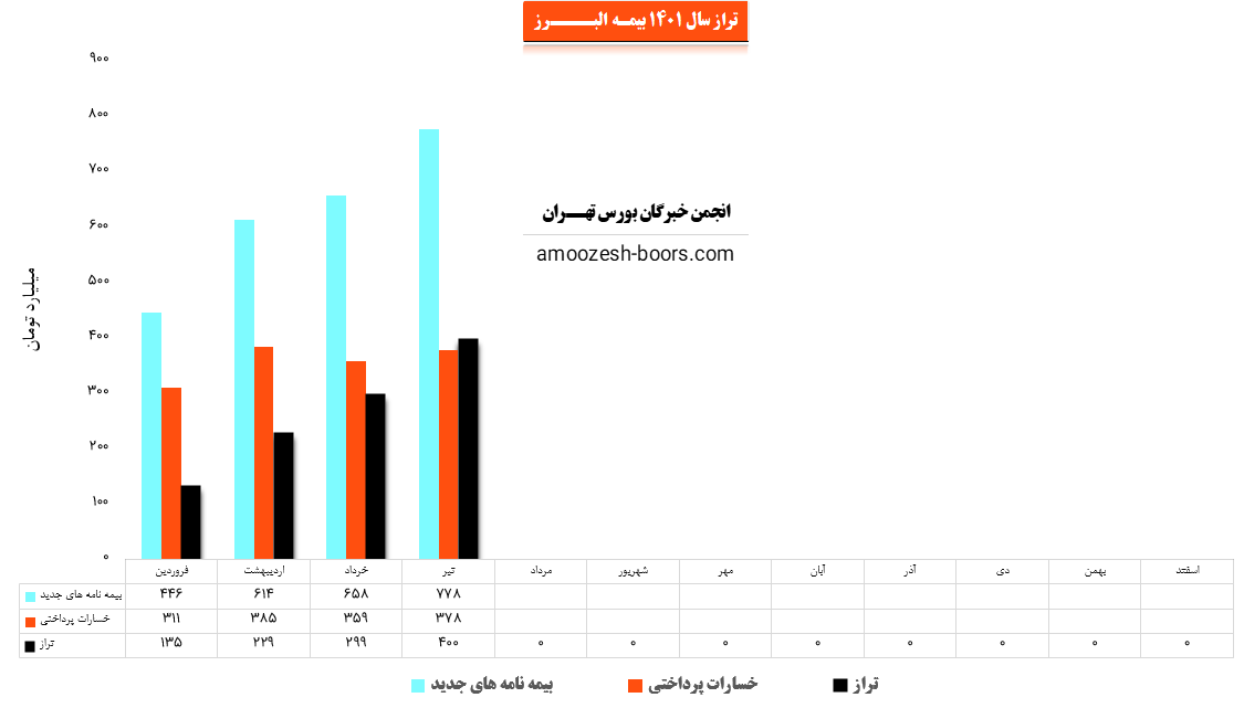 همچنین نماد البرز در تیر ماه مبلغ 378 میلیارد تومان به بیمه نامه های خود خسارت پرداخت کرده که این میزان با افزایش 5 درصدی نسبت به ماه گذشته روبرو شده و لذا با توجه به آمار مذکور تراز البرز با 34% افزایش در مقایسه با ماه گذشته به 400 میلیارد تومان رسیده است.