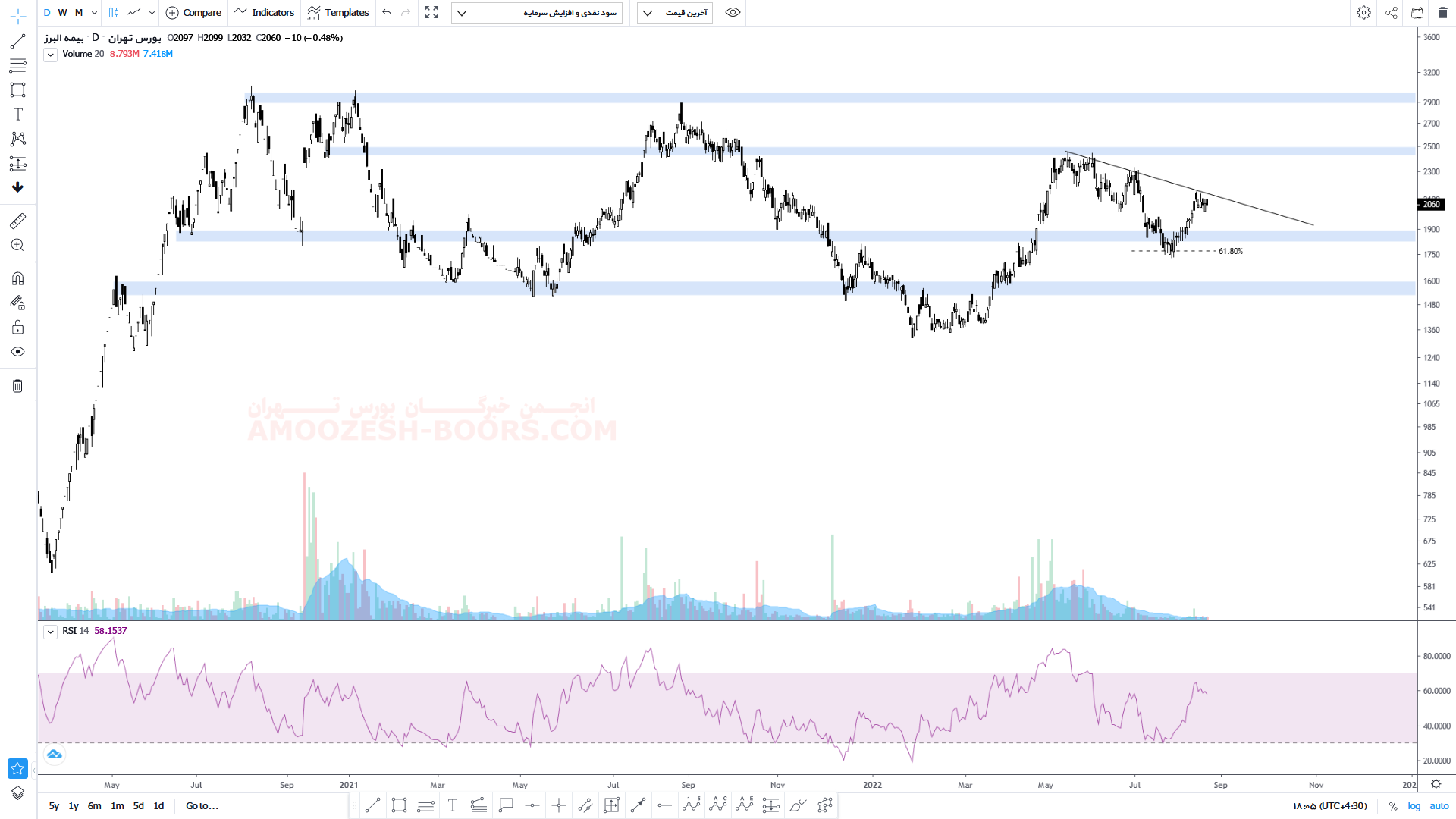 قیمت سهام البرز در حال حاضر درگیر محدوده سقف کانال نزولی میان مدت میباشد در صورت ادامه دار شدن فشار تقاضا و شکست پر فشار این مقاومت حرکت قیمت تا محدوده مقاومت استاتیک 3100 ریال محتمل خواهد بود و همچنین در صورت اصلاح، حمایت بعدی سهم البرز 2100 ریال در نظر گرفته خواهد شد.