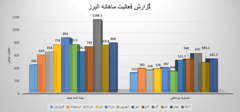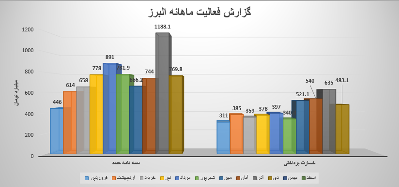 نماد البرز در دی ماه از محل بیمه نامه جدید 769.8 میلیارد تومان درآمد محقق نمود، و معادل 483.1 میلیارد تومان نیز از محل خسارات پرداخت نمود اما در مجموع تراز دی ماه خود را 59% مثبت گزارش نمود و عملکرد تجمیعی خود را از اپتدای سال 42% نسبت به مدت مشابه افزایش داد.