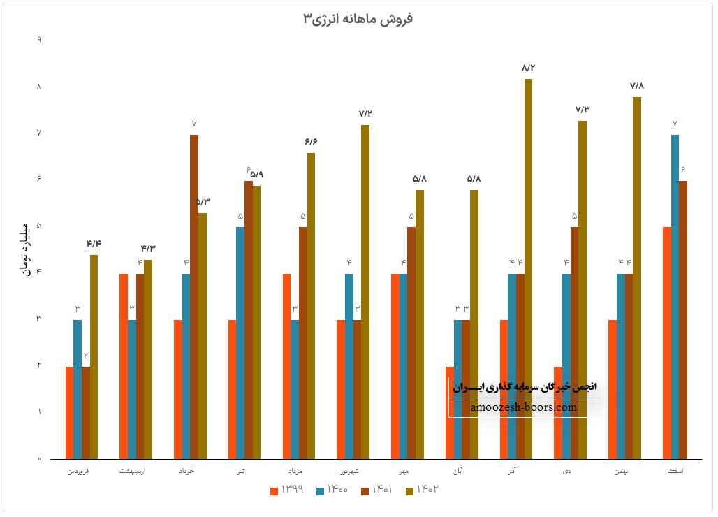 نماد انرژی3 (شرکت بورس انرژی ایران) در بهمن ماه 1402 حدود مبلغ 7/8 میلیارد تومان درآمد داشته که این میزان در مقایسه با ماه گذشته 7 درصد  و همچنین در مقایسه با مدت مشابه سال گذشته حدود 95 درصد رشد پیدا کرده است.