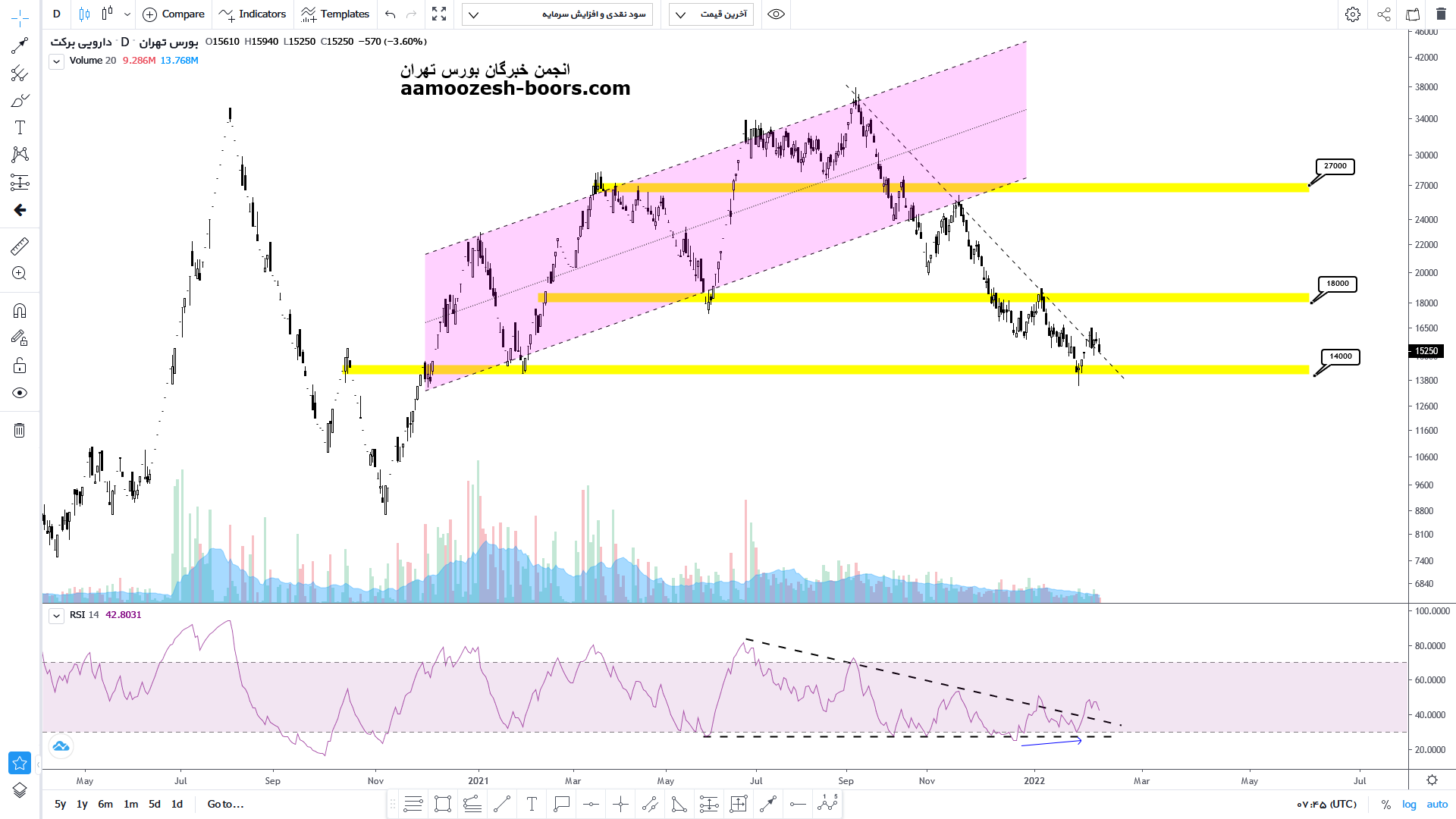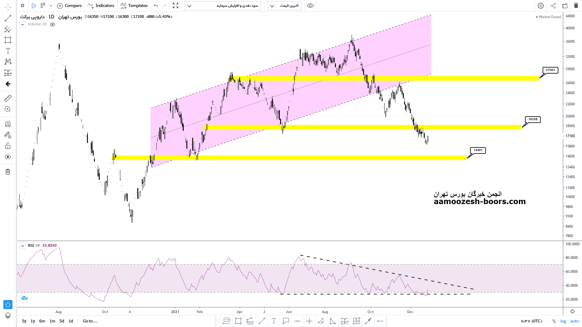 اما در صورت بروز واکنش منفی و عدم تثبیت در شکست خط روند نزولی کوتاه مدت میتواند نزول خود را تا محدوده حمایتی 1400 تومان و در صورت شکست تا محدوده حمایتی 900 الی 1000 تومان ادامه دهد