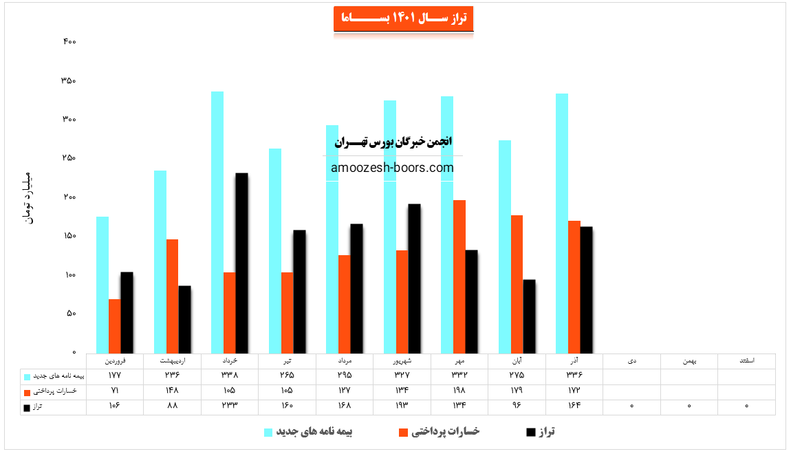 نماد بساما (شرکت بیمه سامان) در آذر ماه سال 1401 حدود مبلغ 336 میلیارد تومان بیمه نامه جدید صادر کرده که این میزان در مقایسه با ماه گذشته 22% افزایش پیدا کرده است.