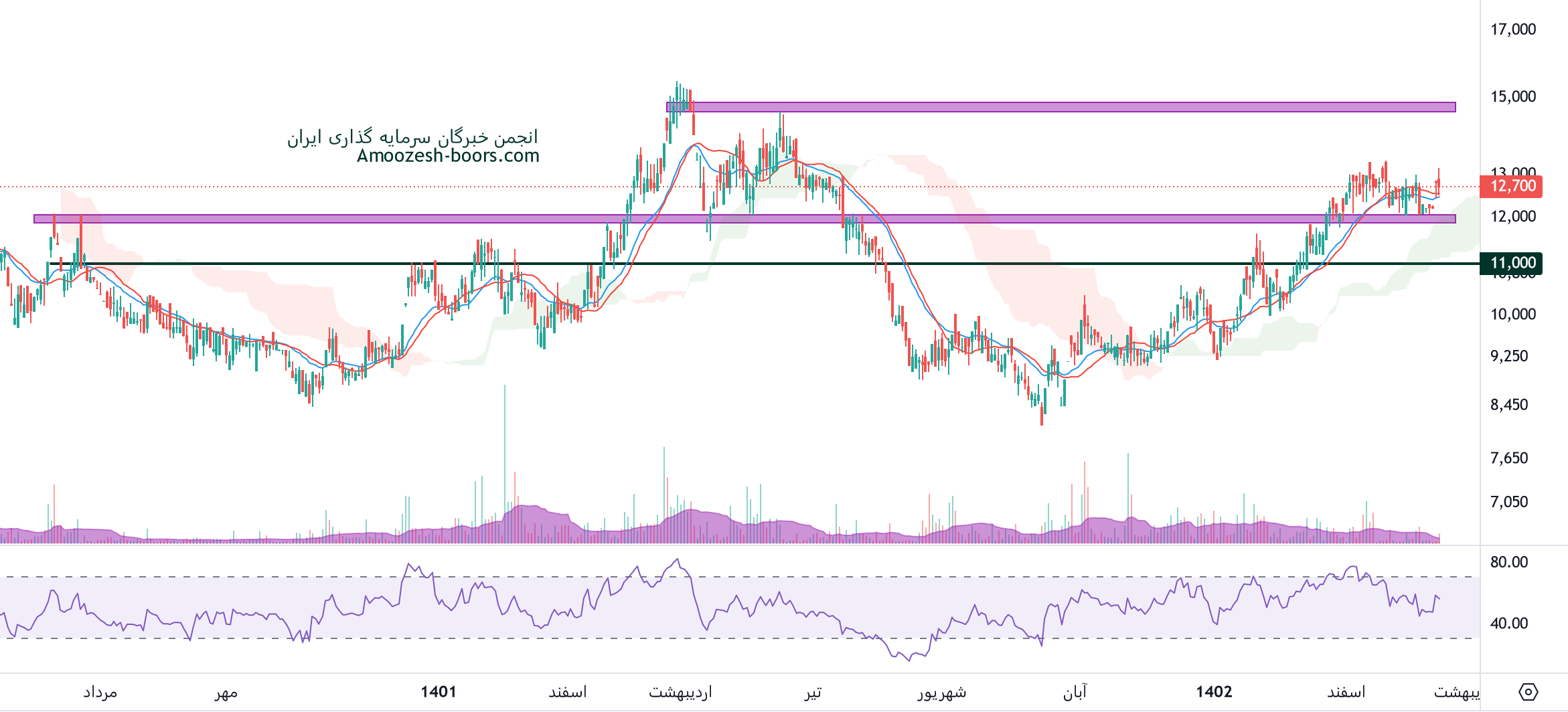 بعد از اصلاحی که روی چارت انجام شده قیمت به محدوده امنی رسیده است، محدوده حمایت بساما محدوده 12000 ریال ارزیابی میگردد، در صورت تثبیت قیمت در این محدوده و ثبت کندل های مثبت، میتوان انتظار حرکت قیمت تا محدوده 15000 ریال را داشت، همچنین در صورت ادامه دار شدن اصلاح و از دست رفتن حمایت نماد بساما که در بالا ذکر شد، حمایت بعدی 11000 ریال خواهد بود.