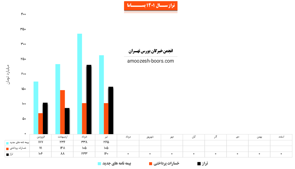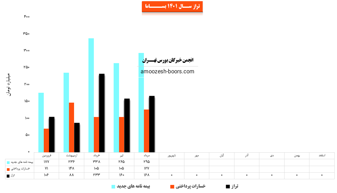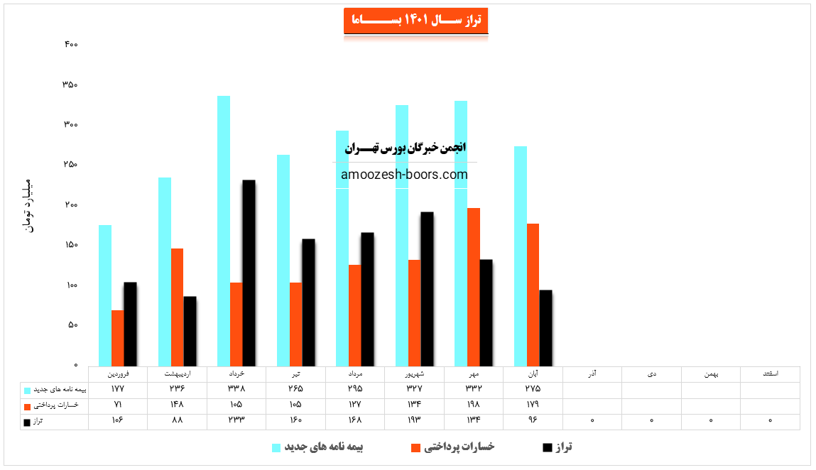 همچنین بسامادر مرداد ماه مبلغ133.7 میلیارد تومان به بیمه نامه های خود خسارت پرداخت کرده که این میزان تغییر محسوسی نسبت به ماه قبل نداشته است . و لذا با توجه به آمار مذکوررکت در این دوره تراز مثبت 194 میلیارد تومان (145%) را ثبت کرده است. تراز نماد بساما در این دوره نسبت به ماه قبل 15% افزایش و نسبت به میانگین ماه های قبل 195% افزایش داشته است. شرکت نسبت به دوره 1 ماهه مشابه سال قبل 43% کاهش تراز داشته است.
