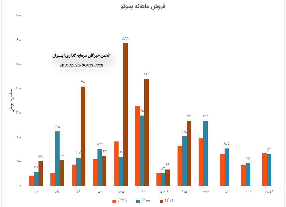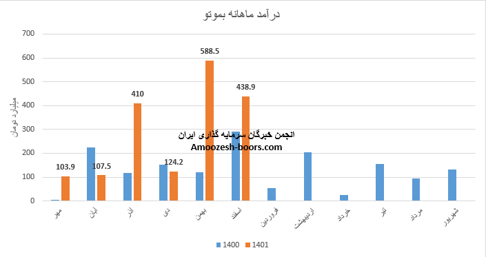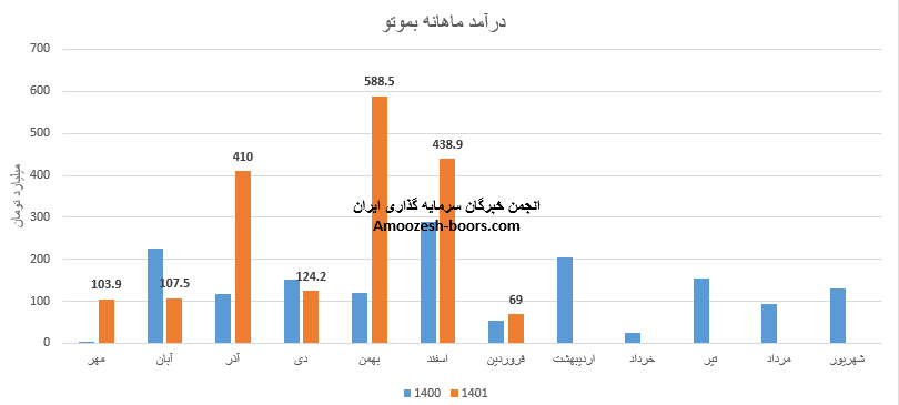 شرکت موتوژن با نماد بموتو سال مالی متفاوتی داشته و در ششمین ماه از سال مالی 438.9 میلیارد تومان را محقق نموده است، تغییرات درآمد ماهانه سهم بموتو به شرح زیر میباشد، 25% کاهش نسبت به ماه گذشته، 64% افزایش نسبت به متوسط ماهانه، 51% نسبت به مدت مشابه سال قبل، الکترو موتور کولری که پر فروش ترین محصول شرکت موتوژن میباشد در اسفند ماه سال 1401 با افزایش 14 درصدی نرخ همراه بوده، میزان فروش این محصول نسبت به ماه قبلی 55% کاهش داشته است، مجموعا عملکرد 6 ماهه نماد بموتو 13% از کل درآمد سال قبل بیشتر بوده.