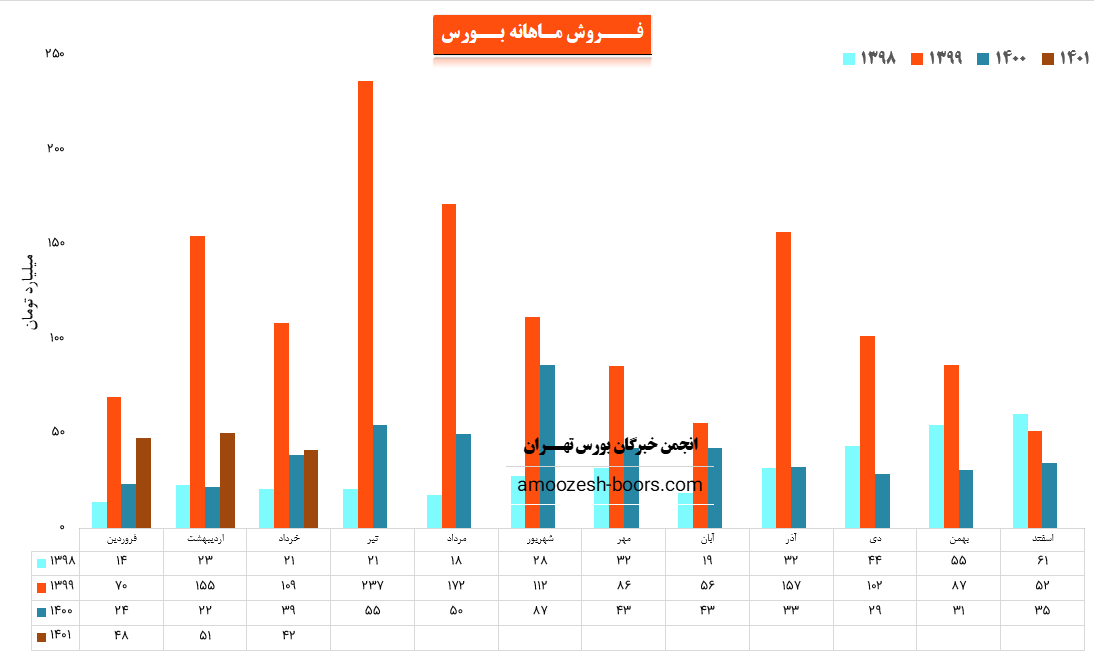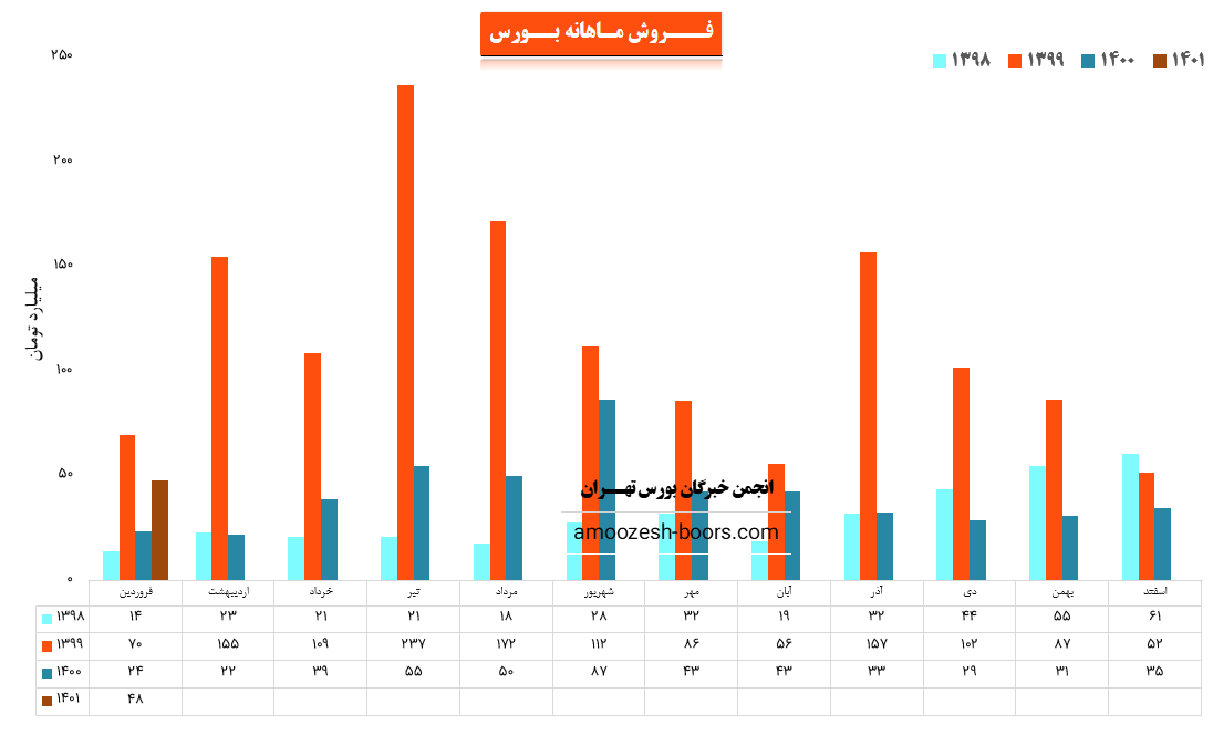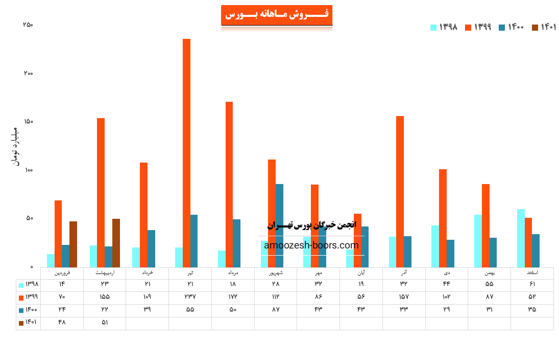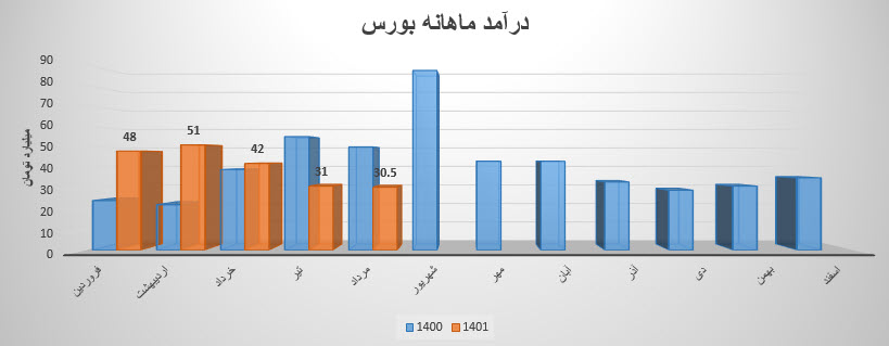 سهم بورس در فروردین ماه 1401 و در اولین ماه از سال جاری حدود مبلغ 48 میلیارد تومان درامد داشته که این میزان نسبت به ماه گذشته 37% و همچنین نسبت به مدت مشابه سال گذشته 100% رشد درامد پیدا کرده است!