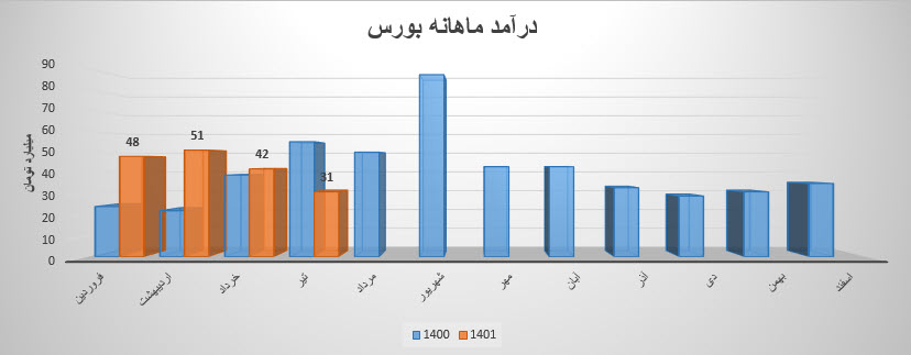 متوسط درآمد ماهانه سال مالی گذشته سهم بورس برابر 42 میلیارد تومان بوده است. در سال مالی جاری نیز متوسط درآمد برابر40 میلیارد است و درآمد سهم بورس نسبت به میانگین ماه های قبل 34% کاهش داشته است.