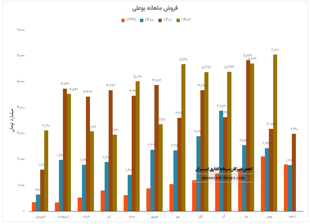 فروش بوعلی در این ماه افزایش 2% در مقایسه با ماه گذشته داشته است، همچنین در مقایسه به مدت مشابه 105% و نسبت به متوسط ماهانه 36% افزایش داشته است.