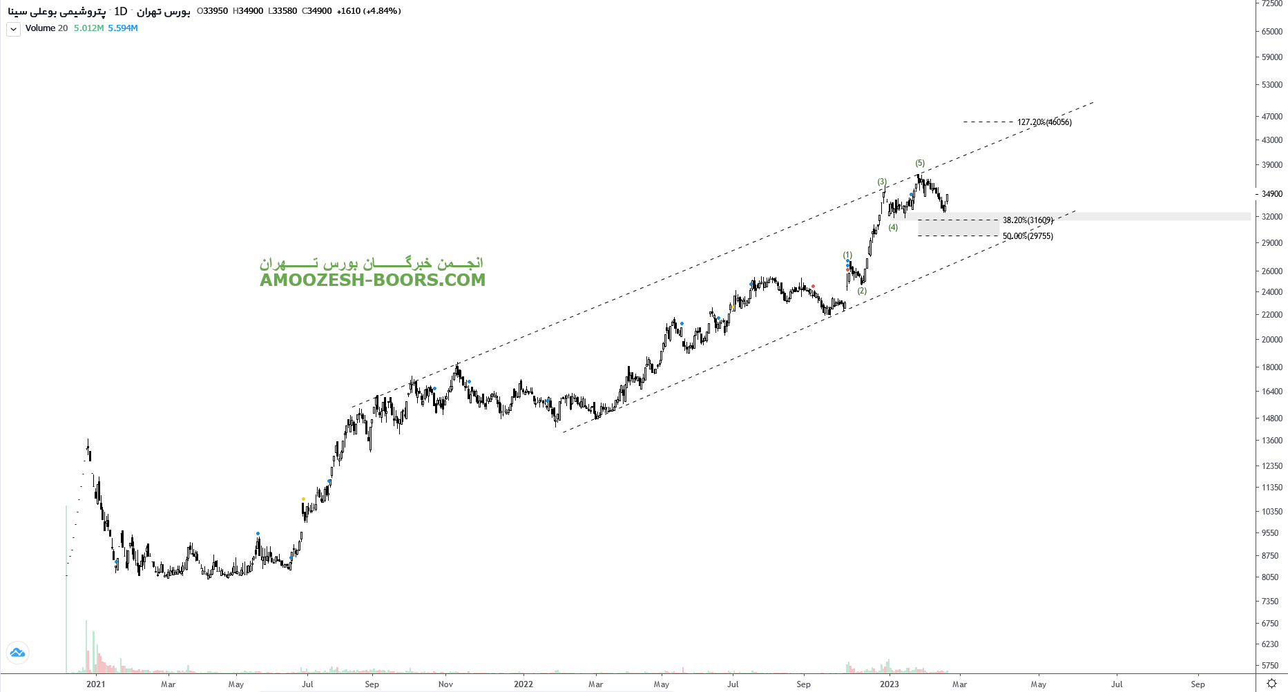 قیمت سهم بوعلی پس از تشکیل یک سیکل پنج موجی ایده آل وارد اصلاح شده، و پس از نشان دادن واکنش مثبت به حمایت ناحیه ۳۲0۰ تومان در حال حرکت به سمت مقاومت سقف کانال صعودی خود می باشد. لذا در همین راستا مقاومت ناحیه ۴۶0۰ تومان مقاومت مهمی برای سهم بوعلی به حساب می آید. همچنین در صورت اصلاح حمایت ناحیه 3000 تومان حمایت اصلی سهم بوعلی تعیین شده است.