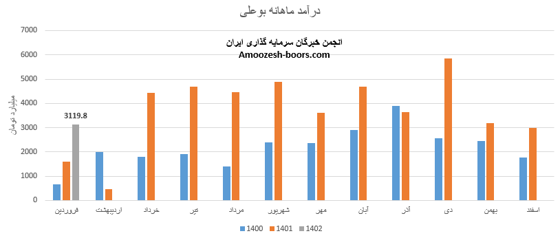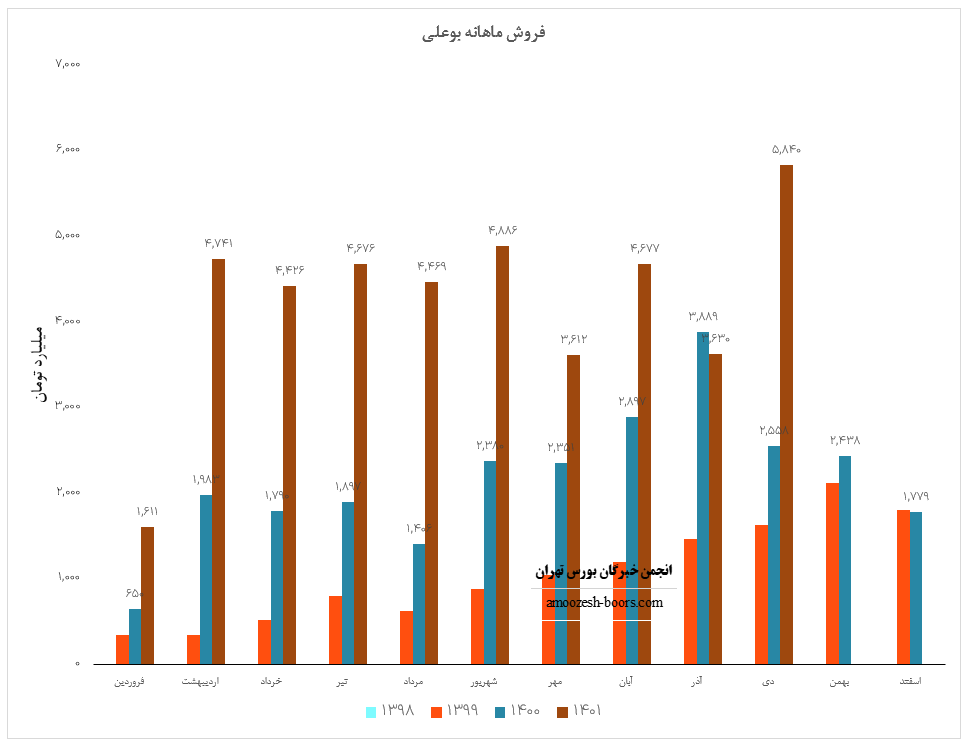 بوعلی در فروردین ماه عملکرد خوب 3119.8 میلیارد تومانی را شناسایی نموده که به ترتیب افزایش 94 و 4 درصدی را نسبت به مدت مشابه و ماه قبلی داشته است، این فروش تماما از طریق فروش داخلی تامین گردیده و به دلیل افزایش 120 درصدی مقدار فروش ریفرمیت نسبت به ماه گذشته میباشد، نرخ فروش این محصول افت 2 درصدی را تجربه نموده است.