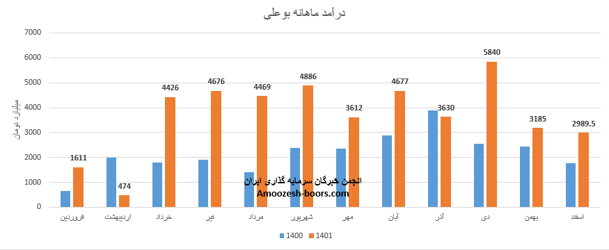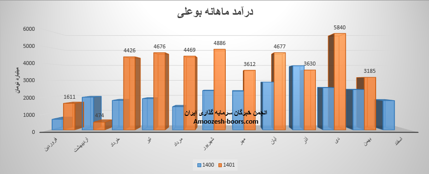 نماد بوعلی (پتروشیمی بوعلی سینا) در دی ماه 1401 حدود مبلغ 5840 میلیارد تومان درآمد داشته که این میزان در مقایسه با ماه گذشته 61% و همچنین در مقایسه با مدت مشابه سال گذشته 128% رشد پیدا کرده است.