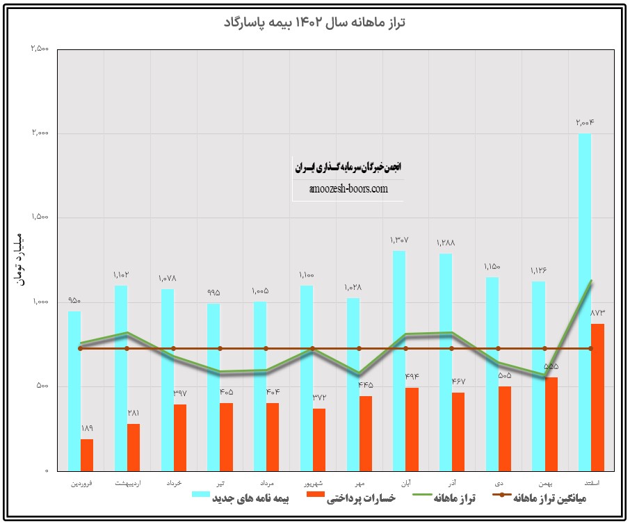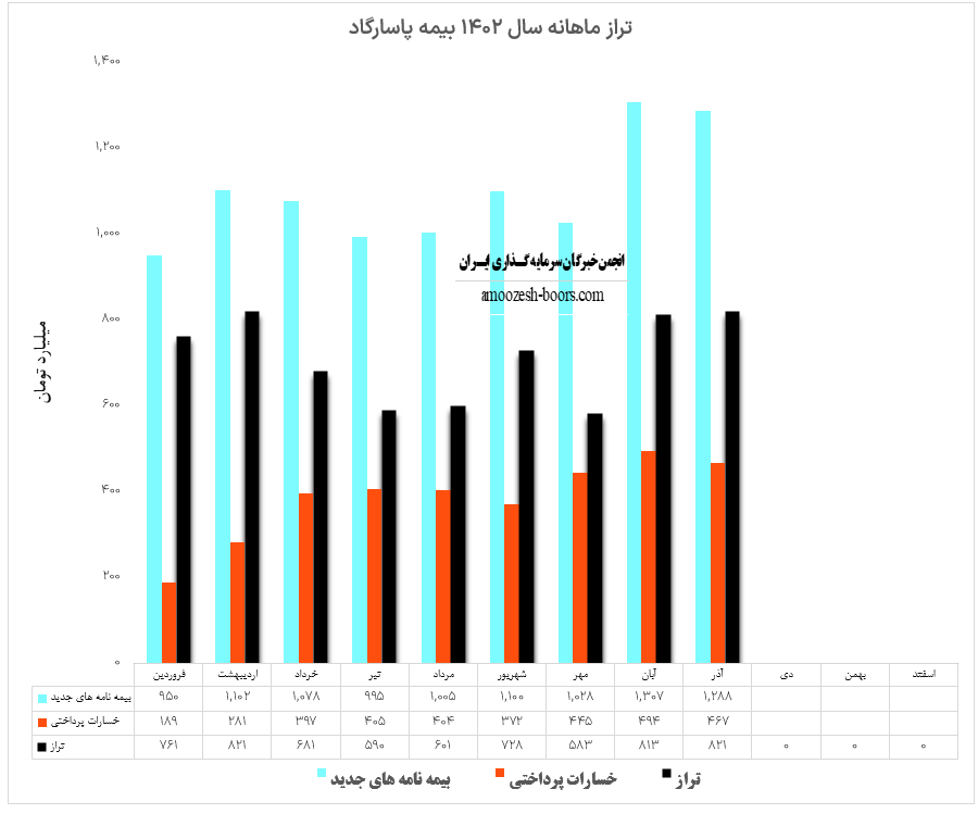 نماد بپاس (شرکت بیمه پاسارگاد) در آذر ماه سال 1402 حدود مبلغ 1288 میلیارد تومان بیمه نامه جدید صادر کرده که این میزان در مقایسه با ماه گذشته 1% کاهش پیدا کرده است. همچنین سهم بپاس در آذر ماه مبلغ 467 میلیارد تومان به بیمه نامه های خود خسارت پرداخت کرده که این میزان با کاهش 5 درصدی نسبت به ماه گذشته روبرو شده و لذا با توجه به آمار مذکور تراز بپاس با 1% رشد در مقایسه با ماه گذشته به مثبت 821 میلیارد تومان رسیده است.
