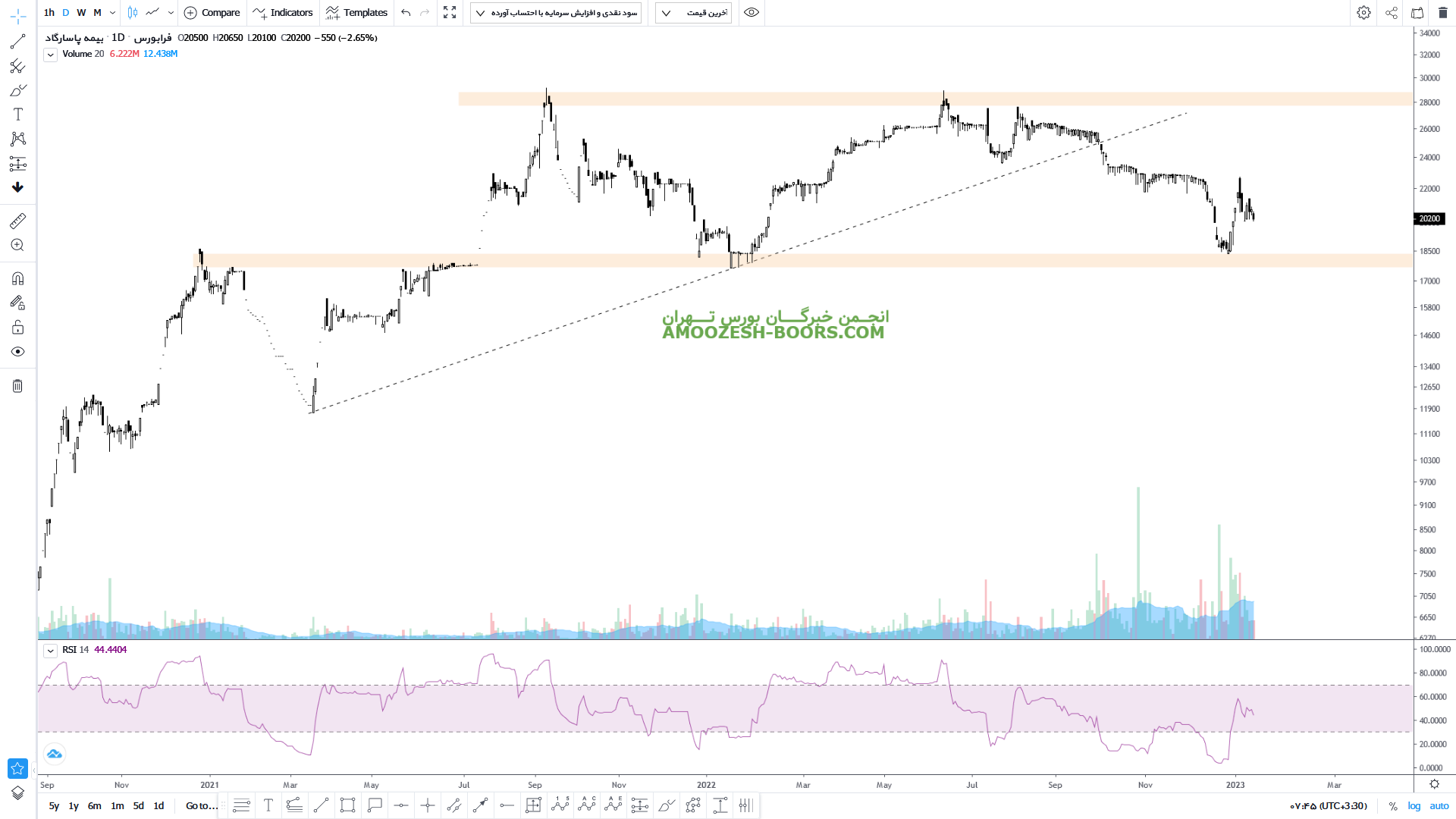 نماد بپاس در حال شکستن محدوده مقاومتی 21000 ریال میباشد، در صورت تثبیت قیمت در این محدوده، حرکت سهم بپاس تا 23000 ریال محتمل میباشد، همچنین در صورت اصلاح و از دست رفتن این محدوده حمایتی، حمایت بعدی 18500 ریال در نظر گرفته خواهد شد.