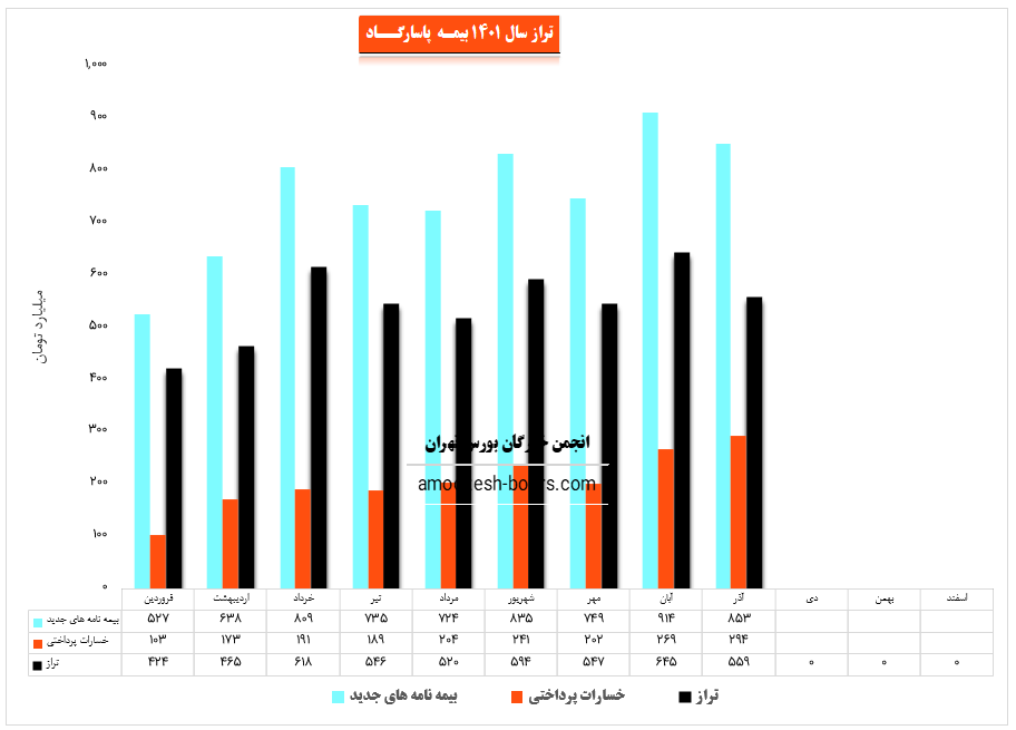 نماد بپاس (شرکت بیمه پاسارگاد) در آذر ماه سال 1401 حدود مبلغ 724 میلیارد تومان بیمه نامه جدید صادر کرده که این میزان در مقایسه با ماه گذشته 7% کاهش پیدا کرده است.