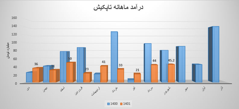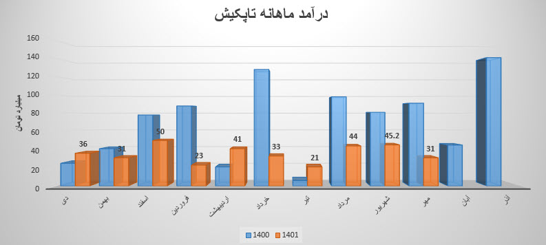 سهم تاپکیش (شرکت تجارت الکترونیک پارسیان کیش) در تیر ماه ۱۴۰1 حدود مبلغ 21 میلیارد تومان درآمد داشته که این میزان در مقایسه با ماه گذشته 36% کاهش و همچنین در مقایسه با مدت مشابه سال گذشته 250% رشد درآمد پیدا کرده است.
