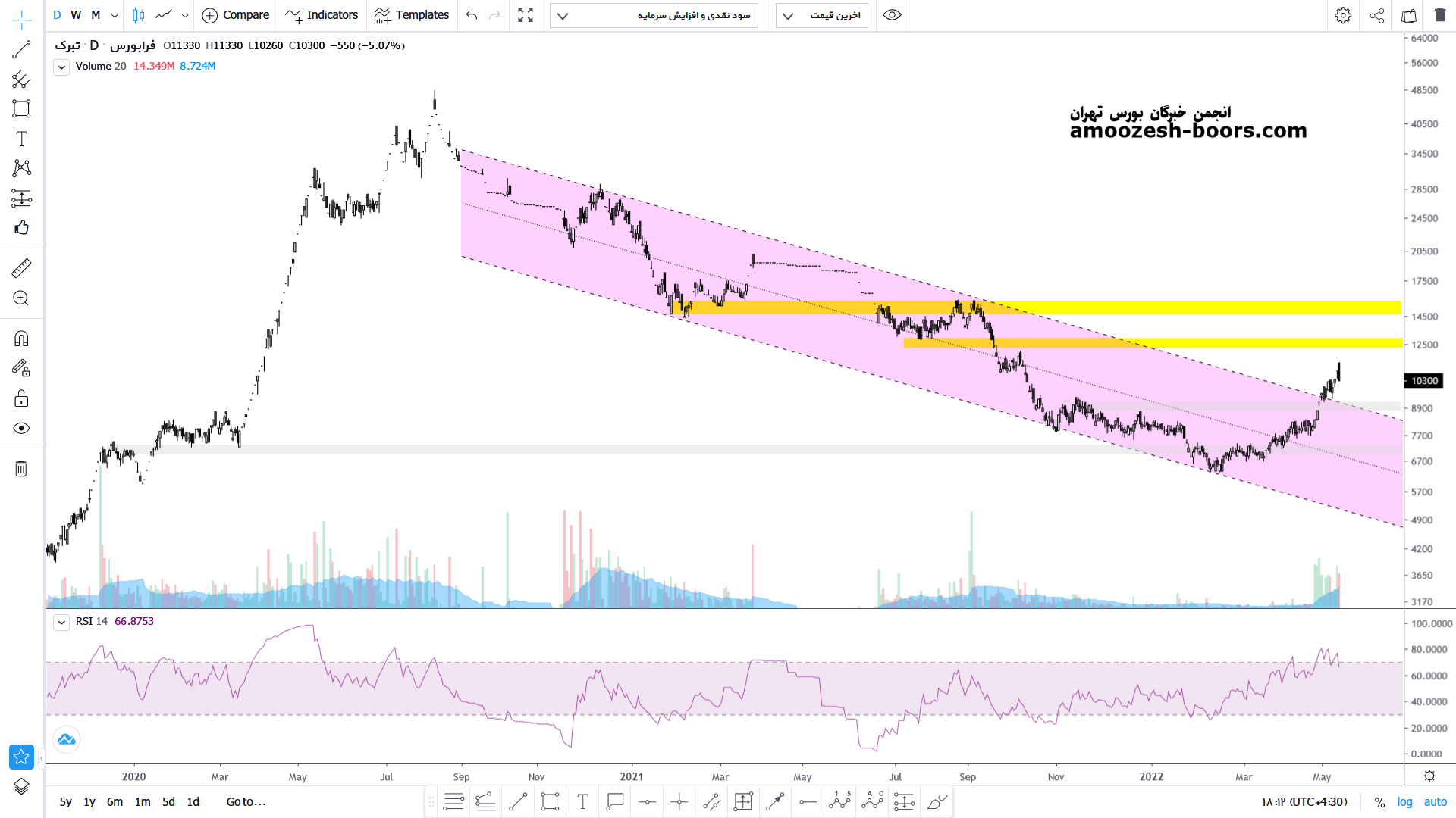 قیمت سهم تبرک پس از برخورد به محدوده حمایتی قوی کف کانال نزولی خود و با ایجاد یک رالی صعودی توانسته سقف کانال نزولی خود را بشکند. اکنون در حال پیشروی به سمت مقاومت محدوده ۱۳۰۰ تومان میباشد در صورت بروز واکنش منفی به این محدوده مقاومتی می تواند حمایت محدوده ۷۵۰ تومان را مجدد تست کند این در حالی است که قیمت حمایت محدوده هزار تومان را به سمت پایین قطع کند اما در صورت شکست مقاومت مهم می تواند رشد خود را محدوده مقاومت بعدی یعنی محدوده 1600 تومان نیز ادامه دهد.
