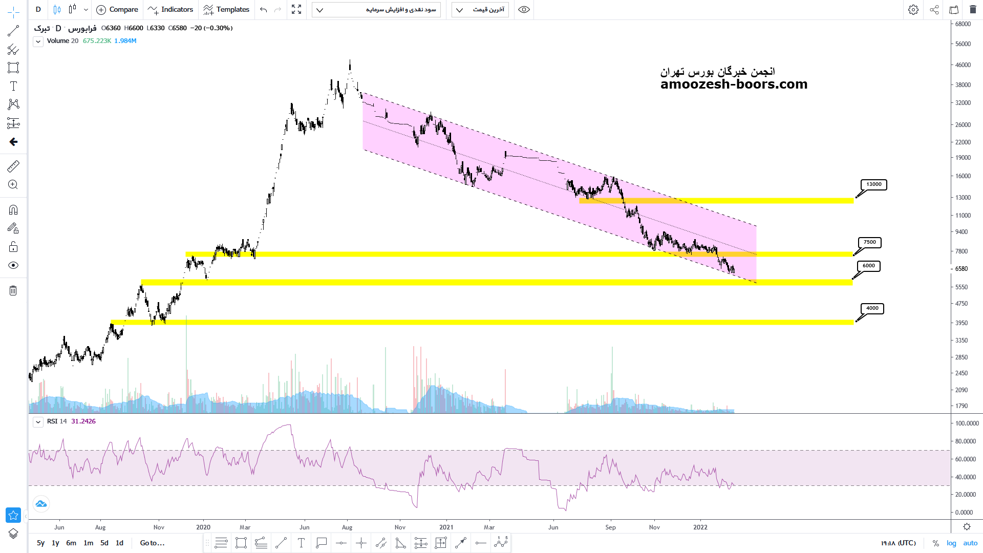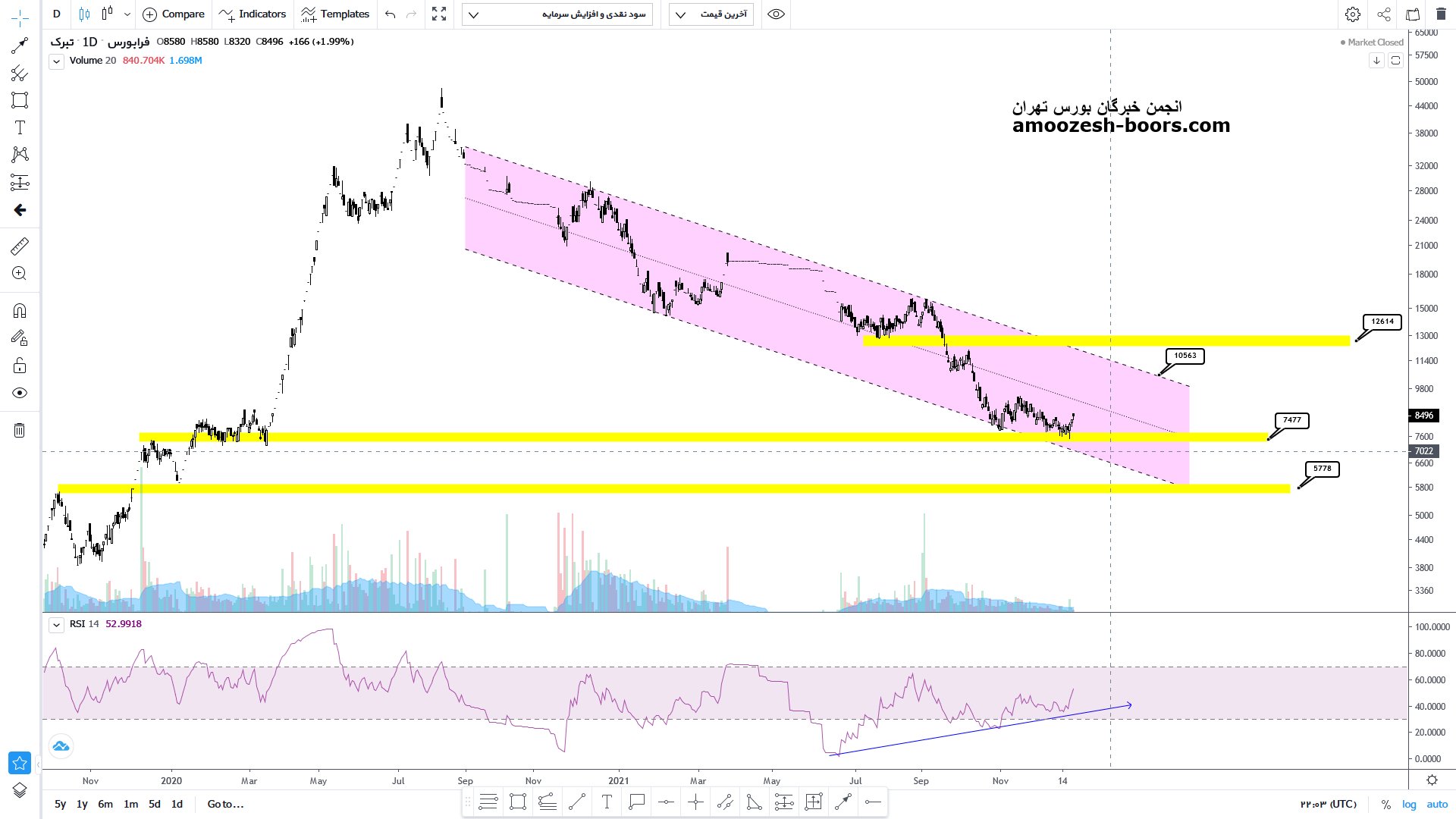 قیمت نماد تبرک پس از اصلاح ۸۶ درصدی از سقف تاریخی خود اکنون به محدوده حمایتی مهم کف کانال نزولی یک سال و نیمه خود رسیده است اگر این محدوده حمایتی مهم را با محدوده کلاسیکی ۶۰۰ تومان ترکیب کنیم متوجه اهمیت بالای این محدود خواهیم شد در صورت حمایت از این محدوده قیمت میتواند تا میدلاین کانال و مقاومت محدوده ۷۵۰ تومان و در صورت شکست تا محدوده سقف کانال نزولی صعود خود را ادامه دهد.