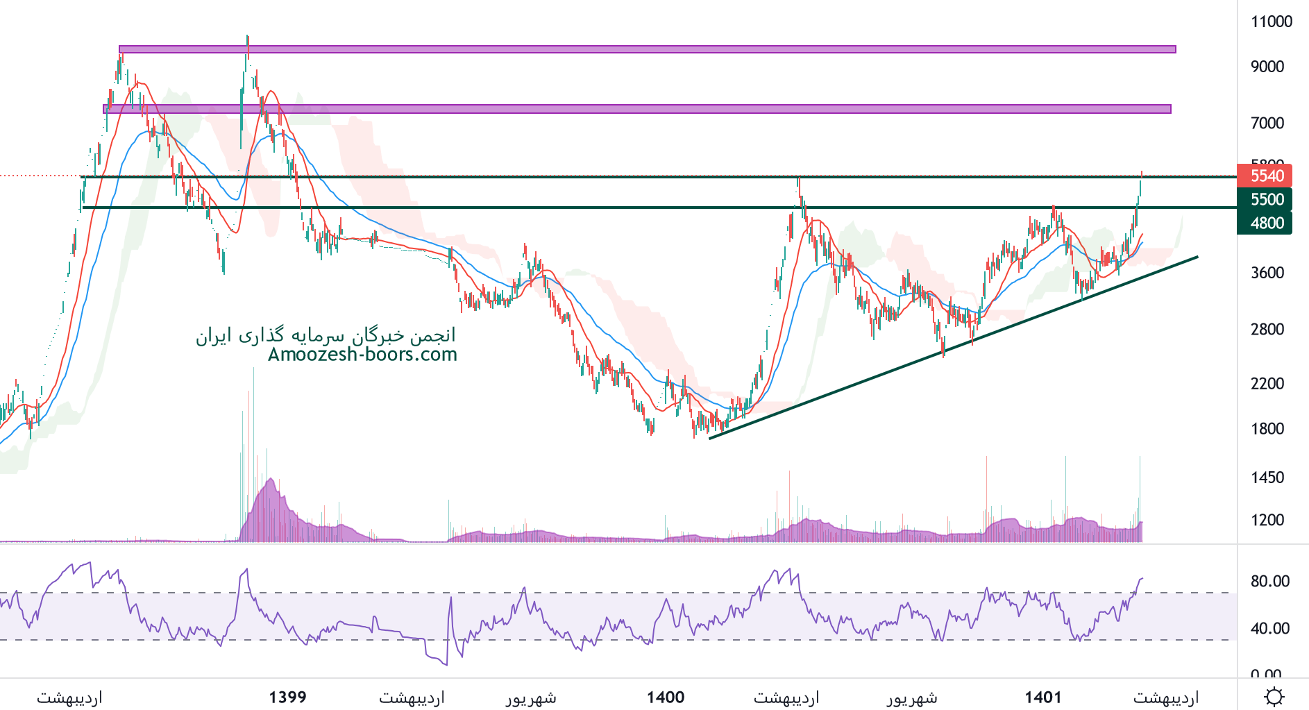 نماد تلیسه از سطح مقاومتی 5500 ریال عبور کرده، در صورت حفظ این محدوده و تثبیت بالای این سطح، حرکت سهم تا محدوده 7000 ریال محتمل خواهد بود، همچنین در صورت از دست رفتن محدوده 5500 ریال، اولین حمایت سهم تلیسه 4800 ریال در نظر گرفته خواهد شد.