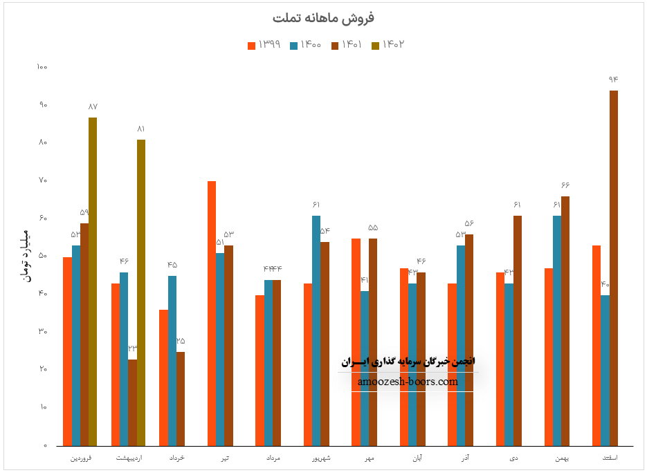نماد تملت ( تامین سرمایه بانک ملت ) با افزایش 23 درصدی درآمد نسبت به ماه گذشته به فروش 99.6 میلیارد تومان رسیده است، فروش ماهانه سهم تملت نسبت به متوسط ماهانه 20% و نسبت به مدت مشابه 88% رشد داشته است، درآمد بازار گردانی که عمده فروش سهم تملت را تشکیل میدهد نسبت به ماه گذشته رشد 31 درصدی داشته است، مجموع عملکرد 4 ماهه سهم تملت از ابتدای سال مالی نسبت به مدت مشابه بهبود 118 درصدی داشته و طی این مدت 55% از کل درآمد سال قبل محقق گردیده است.