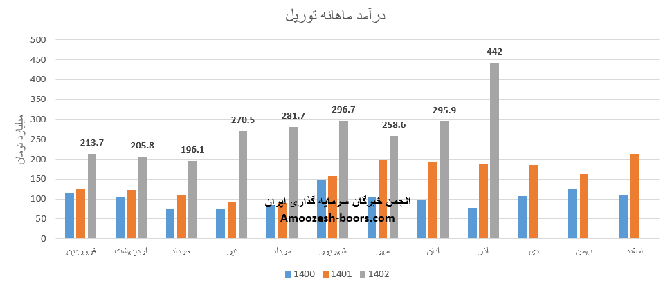 فروش آذر ماه سال 1402 سهم توریل 442 میلیارد تومان گزارش شده است، تغییرات درآمدی توریل به شرح زیر میباشد:
