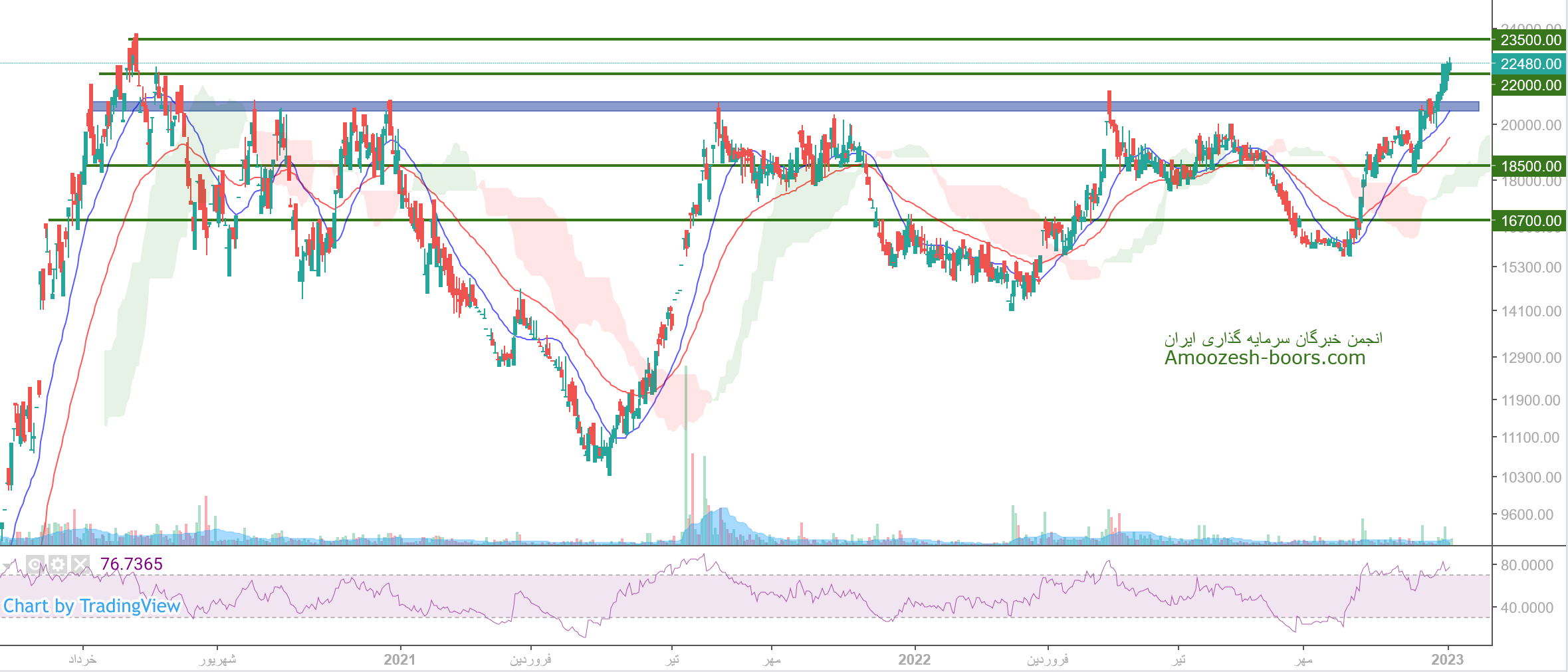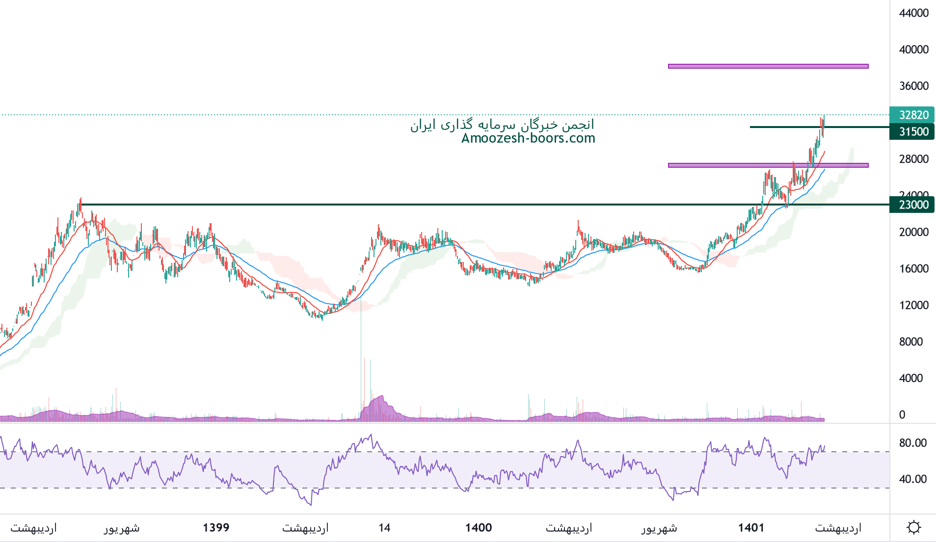 نماد تیپیکو در حال حاضر درگیر مقاومت 22000 ریال میباشد، در صورت عبور سهم از این مقاومت، حرکت سهم تا 23500 ریال محتمل خواهد بود، همچنین در صورت اصلاح ، حمایت های سهم به ترتیب 20500 و 18500 ریال در نظر گرفته خواهد شد، که حمایت 20500 ریال برای ورود پله ای منطقی خواهد بود.